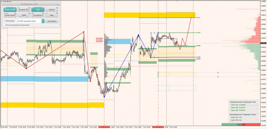 Долгосрочная тенденция: в лонг. Максимальное скопление объемов расположено в диапазоне, по котировкам 0.64573-0.64938. В настоящий момент по паре совершаются инвестиционные операции внутри указанного диапазона, указывая на временную неопределенность.