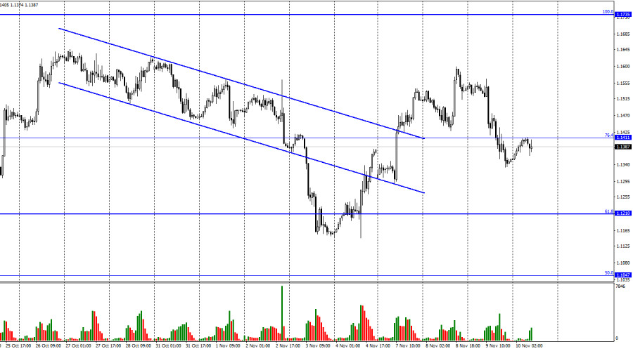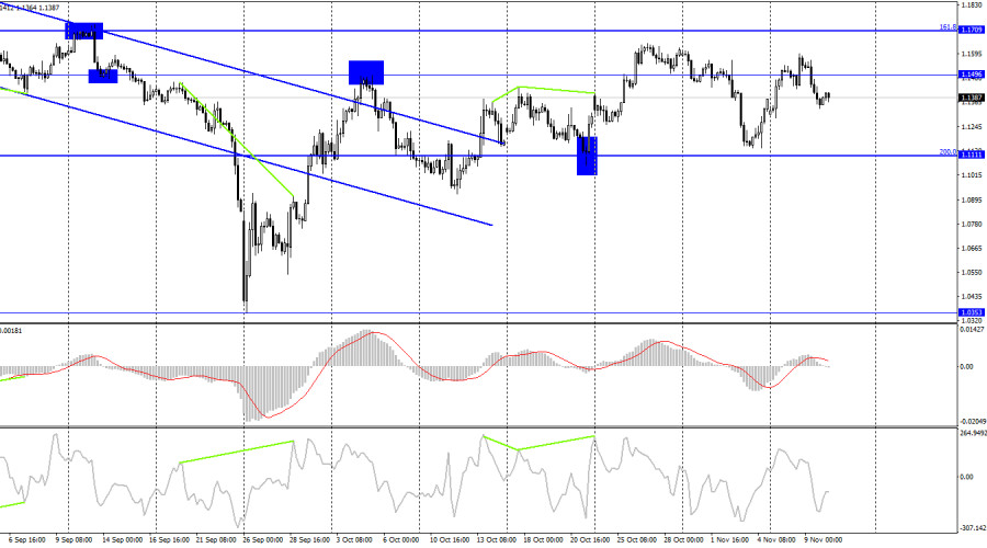 Добрый день, уважаемые трейдеры! На часовом графике пара GBP/USD в среду выполнила разворот в пользу американской валюты и начала процесс падения, закрепившись под уровнем коррекции 76,4% - 1,1411. Сегодня был выполнен отбой от уровня 1,1411, поэтому высокие шансы на падение пары в направлении коррекционного уровня 61,8% - 1,1210 так и остаются высокими. Напомню, что во второй половине дня выйдет отчет по американской инфляции, который может вызвать бурю эмоций на рынке. Скучным сегодняшний день получится не должен. А пока все дожидаются отчета по инфляции, я хотел бы обратить внимание на промежуточные итоги промежуточных выборов в Парламент США. На кону все 435 мест в Палату представителей и 35 мест в Сенат. На данный момент можно с уверенностью говорить лишь об одном: Палату представителей выиграли республиканцы, так как они уже набрали 220 мест в нем, а для большинства требуется 218. Однако в Сенате борьба более ожесточенная. По различным данным лидируют сейчас республиканцы, но имеют преимущество всего в 1-2 места. Остаются неизвестными результаты в трех штатах: Аризоне, Неваде и Джорджии. Также отмечу, что демократам, чтобы контролировать Сенат, не требуется набрать больше мандатов, чем республиканцам. Даже при полном равенстве именно они будут иметь лидирующие позиции, так как решающий голос будет иметь вице-президент США Камала Харрис, которая является демократом. Окончательные результаты выборов станут известны только в начале декабря. Подсчет голосов продолжается. Так как американская валюта росла и вчера, и сегодня я могу предположить, что победа республиканцев будет благоприятным исходом для нее. Однако в то же время трейдеры могут ожидать слабых данных по американской инфляции и покупать доллар, ожидая, что ФРС будет продолжать повышать процентную ставку высокими темпами. Или хотя бы будет делать это дольше, чем ожидается сейчас. Таким образом, сложно сказать, что сейчас стимулирует доллар: результаты американских выборов или будущий отчет по инфляции. На 4-часовом графике пара выполнила разворот в пользу американской валюты и начала новый процесс падения в направлении уровня Фибо 200,0% - 1,1111. Назревающих дивергенций сегодня не наблюдается ни у одного индикатора. К уровню 1,1709, который был целевым, выйти быкам не удалось. Британец может готовиться к новому падению. Отчет Commitments of Traders (COT):