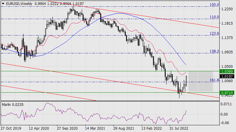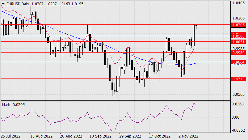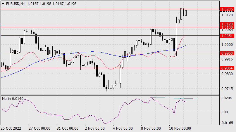 Прогноз по EUR/USD на 11 ноября 2022 годаИнстаФорекс - Instaforex, 3 года назад Выход вчерашних данных по инфляции в США всколыхнул рынки не на шутку. Настолько, что с технической стороны была сломлена перспектива завершения восходящей коррекции от 28 сентября, появились варианты со среднесрочным ростом (в несколько месяцев) и внутри этого назревающего растущего тренда появились дополнительные множественные сценарии. Одним из них является продолжительный боковой тренд в диапазоне 0.9710-1.0360, этот диапазон отмечен на недельном графике. По сути это продолжение коррекции некоего долгосрочного понижающегося тренда, коррекция может продолжаться до уровня Фибоначчи 138,2%, в область 1.0950, а долгосрочный тренд может продолжаться до 0.9340 или ниже. Вариант с боковиком в диапазоне 0.9710-1.0360 мы пока рассматриваем как основной. В основу идеи такого варианта принимается мысль об ожидании рынком ближайшего заседания ФРС 14 декабря, на котором должны подтвердиться предположения о повышении ставки не больше чем на 0,50%. К текущему моменту цена достигла целевой уровень 1.0205 и немного откатывается от него. Вчерашний рост составил 196 пунктов. Наибольшая динамика у евро (но падающая) была 19 марта 2020 года (-247 пп) в начале антиковидной истерии. Сейчас мы ждём откат цены в диапазон 1.0100/20. Если диапазон устоит, то цена может попытаться потом преодолеть 1.0205. Если диапазон не устоит, то дальнейшей целью «медведей» станет 1.0051.
