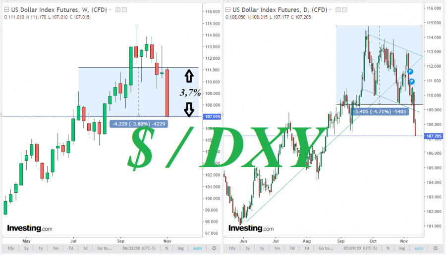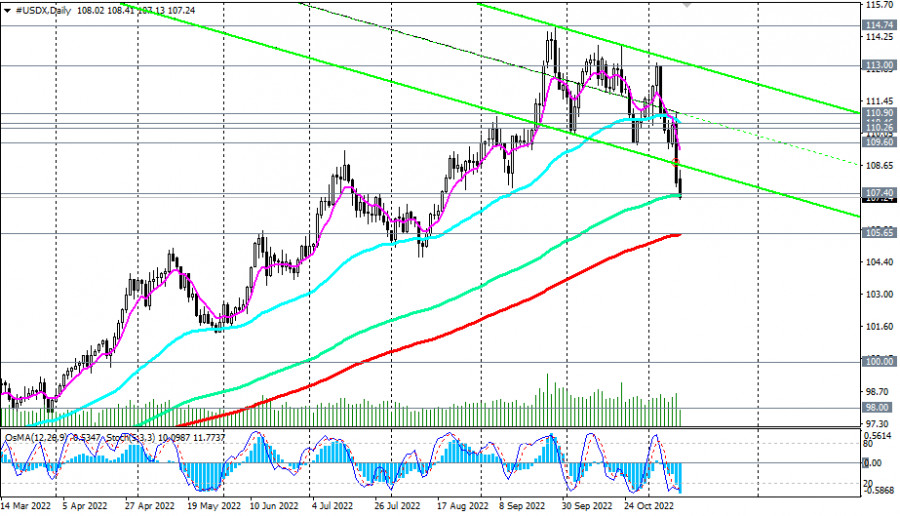 DXY: резкое падение на CPI. Что дальше?ИнстаФорекс - Instaforex, 3 года назад Как мы и предположили в нашем вчерашнем обзоре, «если публикация инфляционных показателей США разочарует инвесторов, то это спровоцирует новую волну распродаж доллара и падение DXY в сторону отметки 109.00». Но падение оказалось еще более глубоким, «подогретое» также опубликованной в это же время (13:30 GMT) трудовая статистика, согласно которой, число первичных заявок на получение пособий по безработице выросло (до 225,0 тыс. с 218,0 тыс. неделей ранее), также оказавшись хуже прогноза о росте до 220,0 тыс. Хотя, это незначительное изменение, оно также негативно повлияло на доллар: в ФРС неоднократно связывали параметры монетарной политики с состоянием рынка труда в стране. Темпы ужесточения монетарной политики также могут замедлиться, если этому будут способствовать показатели рынка труда. Как итог, вчера индекс доллара DXY упал на 1,17%, пробив отметку не только 109.00, но и 108.00 – настолько сильное впечатление на инвесторов произвели опубликованные индексы CPI. Как следует из отчета Бюро трудовой статистики, инфляция в США снизилась в октябре до 7,7% в годовом исчислении (против 8,2% в сентябре и прогноза 8,0%). Базовый индекс потребительских цен (без учета цен на продукты питания и энергоносители) снизился в октябре до 6,3%, с 6,6% месяцем ранее. Таким образом, вероятность повышения ставки ФРС на 75 базисных пунктов в декабре снизилась. Наоборот, теперь участники рынка, согласно данным CME Group, закладывают в цены 80% вероятность повышения процентной ставки ФРС в декабре на 50 б.п. Сегодня в Канаде и США отмечаются национальные праздники, американские банки и биржи закрыты, и доллар по инерции продолжает снижаться. Впрочем, впереди еще предстоит оценить уровень доверия американских потребителей. В 15:00 (GMT) Мичиганский университет опубликует предварительный релиз индекса потребительского доверия. Данный индекс является опережающим индикатором потребительских расходов, на которые приходится большая часть общей экономической активности. Он также отражает уверенность американских потребителей в экономическом развитии страны. Высокий уровень говорит о росте экономики, в то время как низкий указывает на стагнацию. Несмотря на относительно высокое значение показателя, ожидается его небольшое снижение (до 59,5 против предыдущих значений 59,9, 58,6, 58,2, 51,5, 50,0, 58,4, 65,2, 59,4, 62,8, 67,2 в январе 2022 года). Уровень влияния на рынки (предварительного релиза) высокий. Если он все же окажется лучше прогноза и предыдущего значения, то он может несколько возродить бычьи настроения по доллару, вызвав закрытие части коротких позиций по нему, что вызовет некоторый рост доллара и компенсацию части утерянных им вчера позиций. Но пока же медвежьи настроения по доллару сильны. Эту неделю индекс доллара DXY закрывает глубоко на негативной территории. В нашем вчерашнем обзоре «Индекс доллара #USDX: технический анализ и торговые рекомендации на 10.11.2022» мы дали торговые рекомендации: Sell Stop 109.90. Stop-Loss 110.90. Take-Profit 109.60, 109.00, 107.40, 105.70; Buy Stop 110.90. Stop-Loss 109.90. Take-Profit 111.20, 112.00, 113.00, 114.00, 114.74, 115.00. Как видим, сработал сценарий на снижение, цена достигла обозначенных целей и уровней 109.60, 109.00, 107.40. На отметке 107.40 находится сильный уровень поддержки. С технической точки зрения, пройти его сразу не удастся. Вероятен отбой и, как минимум, коррекционный рост в сто