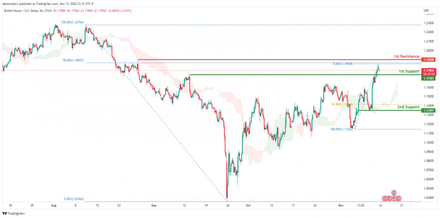 GBP/USD: возможен бычий отскок. Прогноз на 14 ноября 2022ИнстаФорекс - Instaforex, 2 года назад На 4-часовом графике пара GBP/USD движется выше облака Ишимоку, что указывает на бычий импульс. Ожидается, что цена может подняться до 1-го уровня сопротивления 1.19008, соответствующего 78.6% уровню коррекции Фибоначчи и предыдущему уровню свинг-хай. В качестве альтернативы цена может упасть, чтобы повторно протестировать 1-й уровень поддержки 1.17381, соответствующий предыдущему уровню свинг-хай. Торговая рекомендация Вход: 1.17381 Условия для входа: пробитие 1-го уровня поддержки Тейк-профит: 1.13497 Условия для фиксации прибыли: 2-й уровень поддержки Стоп-лосс: 1.19008 Условия для активации ордера стоп-лосс: 1-й уровень сопротивления Материал предоставлен компанией InstaForex - www.instaforex.com |