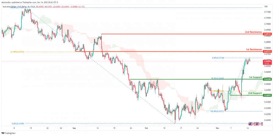AUD/USD: ожидается формирование бычьего импульса. Прогноз на 15 ноября 2022ИнстаФорекс - Instaforex, 2 года назад На 4-часовом графике пара AUD/USD движется выше облака Ишимоку, что указывает на бычий импульс. Ожидается, что цена поднимется до 1-го уровня сопротивления 0.67711, соответствующего уровню коррекции Фибоначчи 161.8%. Если 1-й уровень сопротивления будет пробит, цена направится ко 2-му уровню сопротивления 0.69161, соответствующему предыдущему уровню свинг-хай. В качестве альтернативы цена может упасть до 1-го уровня поддержки 0.65398, где располагается уровень коррекции Фибоначчи 38.2%. Торговая рекомендация Вход: 0.67711 Условия для входа: 1-й уровень сопротивления Тейк-профит: 0.65398 Условия для фиксации прибыли: 1-й уровень поддержки Стоп-лосс: 0.69161 Условия для активации ордера стоп-лосс: предыдущий уровень свинг-хай и 1-й уровень сопротивления Материал предоставлен компанией InstaForex - www.instaforex.com |