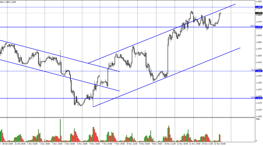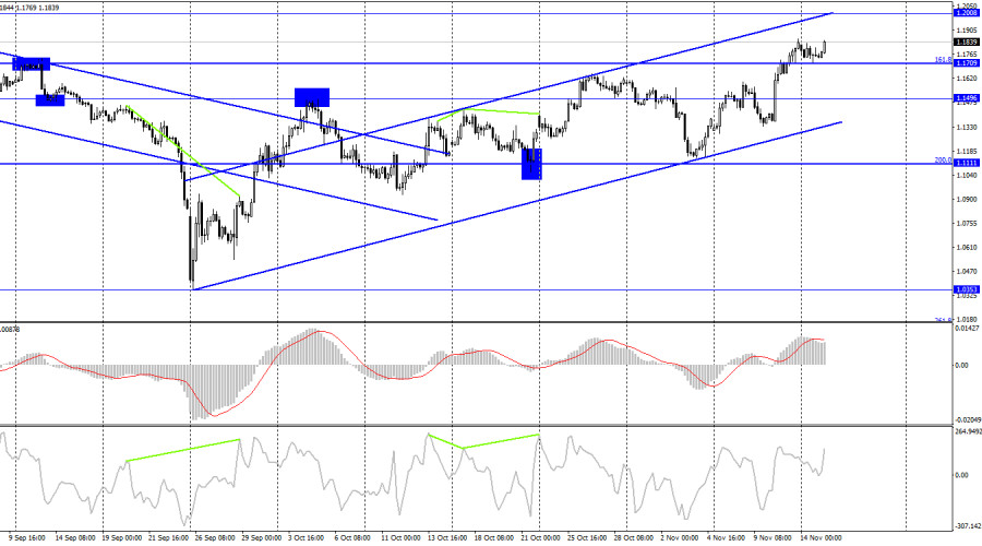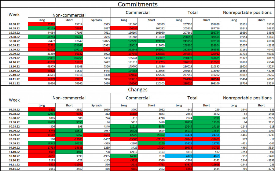 Добрый день, уважаемые трейдеры! На часовом графике пара GBP/USD в понедельник выполнила возврат к уровню коррекции 100,0% – 1,1735, однако отбой от этого уровня сработал в пользу британца, и на текущий момент процесс роста в направлении уровня 1,1883 возобновлен. Отбой котировок от уровня 1,1883 сработает в пользу нового падения пары, а закрытие над ним – в пользу дальнейшего роста в направлении уровня 1,2007. Восходящий трендовый коридор указывает на «бычье» настроение трейдеров. В понедельник для британского фунта не было никаких интересных событий и новостей. Сегодня утром вышли отчеты по безработицы (рост с 3,5% до 3,6%) и заработным платам (рост на 6%). Если рост безработицы – это негативный фактор, то заработные платы можно рассматривать как угодно. В августе они выросли на 6,1%, то есть в сентябре у нас случилось замедление темпов роста при ускоряющейся все сильнее инфляции. Негатив? Негатив. В то же время прогнозы по заработным платам были превышены. Однако я все же считаю, что эти два отчета можно записывать в негатив для британца, как и вышедший ранее отчет по ВВП в третьем квартале. Однако трейдеры-быки все равно продолжают покупать фунт, невзирая на слабую статистику. Похоже, дело кроется в долларе США, так как именно после последнего отчета по инфляции начался сильный рост. На этой неделе выйдет также и отчет по инфляции в Великобритании. Трейдеры ждут, что она опять вырастет. На этот раз до 10,7-11,0% г/г. На мой взгляд, это будет еще один негативный отчет для британца, но трейдеры могут проигнорировать и его. Сейчас на рынке присутствуют более важные факторы, которые перекрывают статистику из Великобритании. Я не верю, что это все тот же отчет по американской инфляции, который вышел уже четыре дня назад. Но трейдеры продолжают покупать фунт, поэтому я думаю, что все дело в их настроении. Доллар рос достаточно долго, чтобы взять на несколько месяцев перерыв. Серьезных факторов роста британца я по-прежнему не вижу. На 4-часовом графике пара выполнила закрепление над уровнем Фибо 161,8% - 1,1709. Процесс роста может быть продолжен в направлении следующего уровня 1,2008. Закрытие курса пары под уровнем 1,1709 сработает в пользу валюты США и некоторого падения в направлении уровня 1,1496. Назревающих дивергенций сегодня нет. Восходящий трендовый коридор характеризует настроение трейдеров как «бычье». Отчет Commitments of Traders (COT):