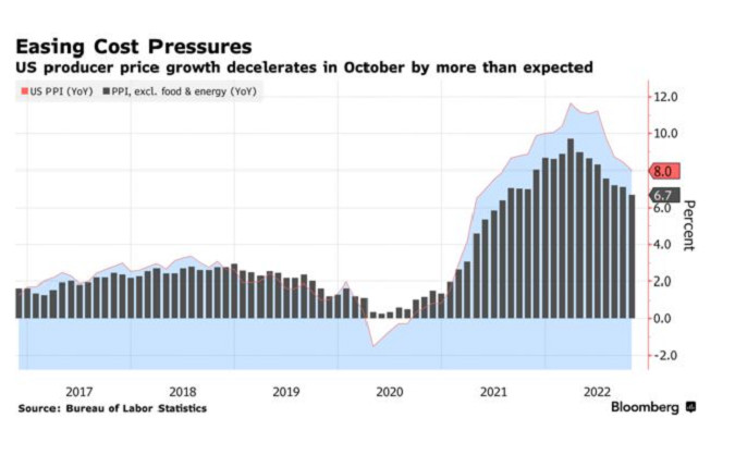 Падение индекса цен производителей в США подбодрило фондовые рынкиИнстаФорекс - Instaforex, 2 года назад Рост цен производителей в США замедлился в октябре больше, чем ожидалось, что является последним признаком того, что инфляционное давление начинает ослабевать. Индекс цен производителей для конечного спроса вырос на 8% по сравнению с прошлым годом, что является наименьшим годовым приростом более чем за год и на 0,2% по сравнению с предыдущим месяцем, показали данные Министерства труда во вторник. Средние оценки в опросе экономистов, проведенном Bloomberg, предусматривали годовой рост на 8,3% и рост на 0,4% по сравнению с предыдущим месяцем. Индекс S&P 500 открылся ростом, а доходность казначейских облигаций снизилась. После пика в марте на уровне 11,7% в годовом исчислении рост цен производителей замедлился на фоне улучшения цепочек поставок, снижения спроса и снижения цен на многие сырьевые товары. Без учета продуктов питания и энергии стоимость товаров в течение месяца снизилась, а цены на услуги упали впервые с 2020 года. Индекс доллара снизился после публикации отчета: Ожидается, что Федеральная резервная система, которая внимательно следит за всеми данными по инфляции, вскоре замедлит темпы повышения процентных ставок, хотя официальные лица подчеркивают, что они по-прежнему твердо привержены сдерживанию инфляции. Многие компании успешно переложили на потребителей большую часть, если не все, увеличение затрат и затрат на рабочую силу, но некоторые компании недавно заявили о нерешительности в отношении дальнейшего агрессивного повышения цен в условиях неопределенной экономической ситуации. |