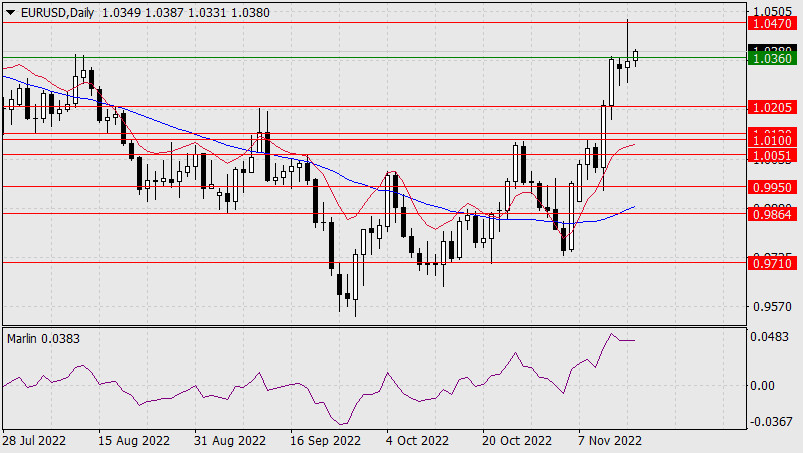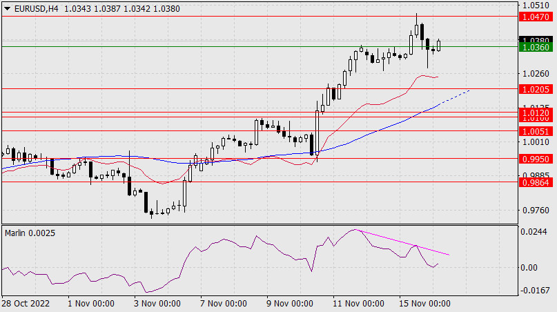 Прогноз по EUR/USD на 16 ноября 2022 годаИнстаФорекс - Instaforex, 2 года назад Во вторник евро предпринял отчаянную попытку роста, достигнув целевой уровень 1.0470 (минимум апреля), после чего цена вернулась под уровень 1.0360. Теперь нам остаётя одно – подождать ещё сутки, чтобы дать цене определиться – повторить ли попытку роста, либо закрепиться под 1.0360 и вернуться к 1.0205 и далее к 1.0100/20. С чисто технической стороны евро наметил разворот, о чём нам говорит осциллятор Марлин.