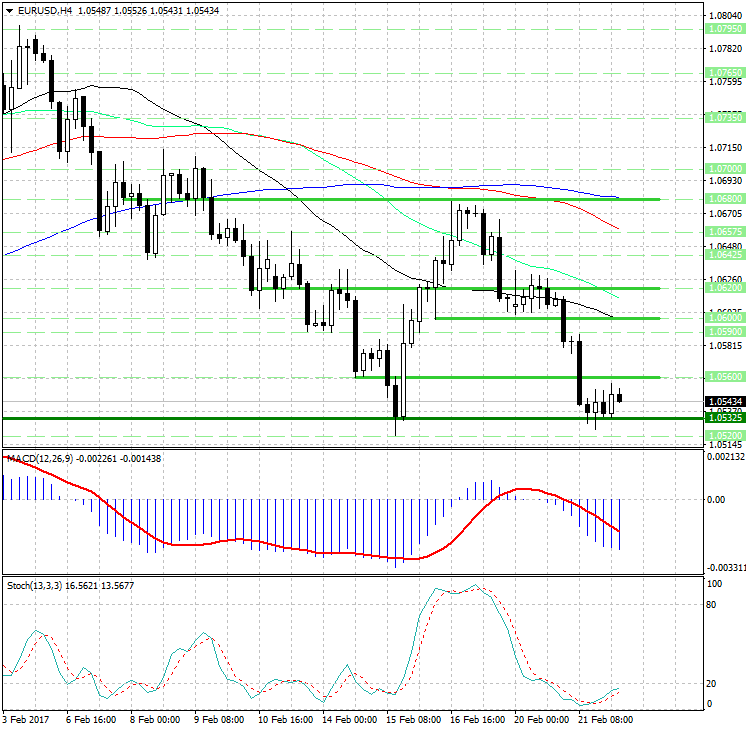 Теперь посмотрим на индикаторы: Курс валюты значительно отдалился от скользящих средних с периодами 34, 55, 89 и 144, которые направлены вниз и указывают на сохраняющиеся медвежьи настроения (в среднесрочной перспективе), а также являются рядом уровней сопротивления 1.0600, 1.06125, 1.0660 и 1.0680. Гистограмма MACD по-прежнему расположена в отрицательной зоне и ниже своей сигнальной линии, продолжает плавно снижаться и тем самым подает сигнал на продажу евро (EUR). Осциллятор стохастик находится в зоне перепроданности и формирует противоположный сигнал, поскольку линия %К поднимается выше линии %D. Из-за противоречия в сигналах, которые подают индикаторы, в качестве подтверждения того, что на рынке форекс в данной валютной паре вновь могут усилиться медвежьи настроения, необходимо дождаться пробоя сильного уровня поддержки 1.05325, который может открыть путь к уровням 1.0470 и 1.0410/00. Отмена 'медвежьего сценария' произойдет лишь в случае пробоя зеркального уровня 1.0560, после чего котировки могут направиться к уровням 1.0600/20 и 1.0680. Форекс трейдерам напомним, что сегодня в 22:00 мск. состоится публикация протокола заседания ФРС, которое состоялось 1 февраля. Более подробная информация о настроениях в федеральном комитете открытого рынка (FOMC) может оказать значительное влияние на дальнейшее развитие событий в данной валютной паре. Уровни сопротивления: 1.0560, 1.0590, 1.0600, 1.06125, 1.0620 Текущая цена: 1.0543 Уровни поддержки: 1.05325, 1.0520, 1.0500, 1.0470, 1.0450, 1.0410/00 |