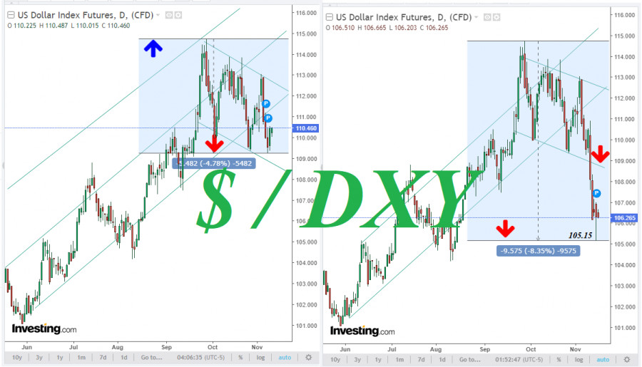 DXY: в ожидании сигнала. На покупку?ИнстаФорекс - Instaforex, 2 года назад Несмотря на то что сегодняшнюю азиатскую торговую сессию динамика доллара не имела четкой направленности, а котировки доллара находились в узком диапазоне, он еще остается под давлением. Как известно, на прошлой неделе были опубликованы инфляционные индикаторы по США, указавшие на замедление инфляции в стране. Индекс потребительских цен CPI снизился в октябре с 8,2% до 7,7% (в годовом исчислении), сильнее прогноза о снижении к 8,0%. Базовое значение (Core CPI) скорректировалось с 6,6% до 6,3% против прогноза 6,5% (также в годовом исчислении). Данные сигнализируют о том, что усилия ФРС по сдерживанию инфляции в США приносят определённые результаты и темпы ужесточения политики в скором времени могут быть замедлены. В минувший понедельник вице-председатель ФРС Лаэль Брейнард отметила, что такие изменения в подходе к определению необходимых параметров монетарной политики являются вполне уместными. В то же время она отметила, что инфляция остается еще слишком высокой и для ее возращения к целевому уровню 2,0% предстоит ещё большая работа. Чуть ранее подобные мысли высказал управляющий ФРС Кристофер Уоллер, допустив возможность замедления темпов повышения процентной ставки. Вчера были опубликованы индексы цен производителей в США за октябрь, которые также продемонстрировали замедление: в месячном исчислении показатель остался на прежнем уровне 0,2% вместо ожидаемого роста до 0,4%, а в годовом – скорректировался с 8,4% до 8,0%. Таким образом, вероятность повышения ставки ФРС на 75 базисных пунктов в декабре снизилась. Наоборот, теперь участники рынка, согласно данным CME Group, закладывают в цены 80% вероятность повышения процентной ставки ФРС в декабре на 50 б.п. В одном из наших недавних обзоров DXY: о чем скажут «свежие» данные по инфляции? мы предположили, что «если публикация инфляционных показателей США разочарует инвесторов, то это спровоцирует новую волну распродаж доллара и падение DXY в сторону отметки 109.00». На тот момент фьючерсы DXY торговались вблизи отметки 110.46, сохраняя негативную динамику и двигаясь в нижней части вновь образовавшегося в прошлом месяце нисходящего канала (на графике DXY). Пробой этих уровней может спровоцировать более глубокое DXY, вплоть до ключевых уровней поддержки 107.40, 105.65. Собственно говоря, это и произошло: цена пробила нижнюю границу нисходящего канала на графике DXY на отметке 109.00 и достигла в последующие 3 дня локального минимума 105.15, и все же выше ключевого уровня поддержки 105.65 (ЕМА200 на дневном графике CFD #USDX) индекс доллара остается в зоне долгосрочного бычьего рынка. При появлении сигналов на покупку предпочтительными вновь станут длинные позиции по DXY. Теперь первым таким сигналом станет возврат цены в зону выше уровня сопротивления 107.40 (ЕМА144 на дневном графике CFD #USDX), а подтверждающим – рост в зону выше отметок 109.00, 110.00. Сегодня участники рынка, следящие за динамикой доллара, будут изучать отчет Бюро переписи США по розничным продажам (подробнее см. в Важнейшие экономические события недели 14.11.2022 – 20.11.2022). На потребительские расходы приходится большая часть общей экономической активности населения, в то время как внутренняя торговля составляет наибольшую часть роста ВВП. Относительное снижение показателя может оказать краткосрочное негативное влияние
