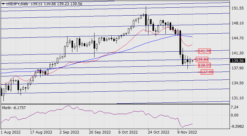 С наибольшей вероятностью цена отработает целевой уровень 141.76, который уже достигла сверху линия Крузенштерна и усилила его. От уровня ждём разворот цены вниз. Если консолидация цены в диапазоне 138.55-139.84 задержится, осциллятор Марлин вернётся в отрицательную область, и тогда может развиться снижение без выхода над 139.84 (или чуть выше, по примеру вчерашнего дня). |
