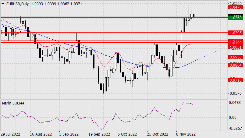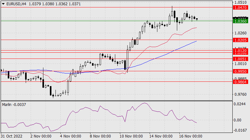 Прогноз по EUR/USD на 17 ноября 2022 годаИнстаФорекс - Instaforex, 2 года назад Не смотря на вчерашнюю попытку евро подрасти (закрытие дня ростом на 45 пунктов) разворотные технические особенности цены только усилились. Осциллятор Марлин дневного масштаба после разворота начинает разгоняться вниз. Цена тонко чувствует уровень 1.0360, как следствие, закрепление под ним открывает цель 1.0205. Но снижение до 1.0205 или ниже будет всё же коррекционным. Для смены тенденции цена должна уйти под индикаторную линию Крузенштерна, которая сейчас весьма глубоко для цены – в диапазоне 0.9864-0.9950. При этом сама линия Крузенштерна развернулась в рост, что затруднит и усложнит развитие ожидаемого разворота.