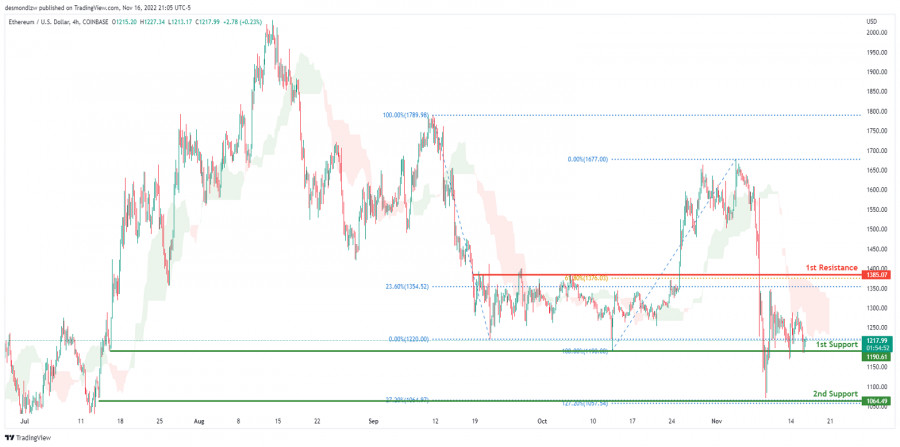 ETH/USD развивает медвежий импульс. Прогноз на 17 ноября 2022ИнстаФорекс - Instaforex, 2 года назад На 4-часовом графике пара ETH/USD торгуется в медвежьем тренде. В настоящее время цена движется ниже облака Ишимоку, что указывает на медвежий импульс. Если медвежий импульс сохранится, цена пробьет 1-й уровень поддержки 1190.61, соответствующий предыдущему лоу и 100% уровню коррекции Фибоначчи, и затем направится ко 2-му уровню поддержки 1064.49, который соответствует уровням расширения Фибоначчи -27.2% и 127.2%. В альтернативном сценарии цена может укрепиться и повторно протестировать 1-й уровень сопротивления 1385.07, соответствующий уровням коррекции Фибоначчи 23.6% и 61.8%. Торговая рекомендация Вход: 1385.07 Условия для входа: 1-й уровень сопротивления, где расположены уровни коррекции Фибоначчи 23.6% и 61.8% Тейк-профит: 1190.61 Условия для фиксации прибыли: 1-й уровень поддержки, где расположены предыдущий уровень свинг-лоу и 100% уровень коррекции Фибоначчи Стоп-лосс: 1677.00 Условия для активации ордера стоп-лосс: область, где располагался предыдущий хай Материал предоставлен компанией InstaForex - www.instaforex.com |