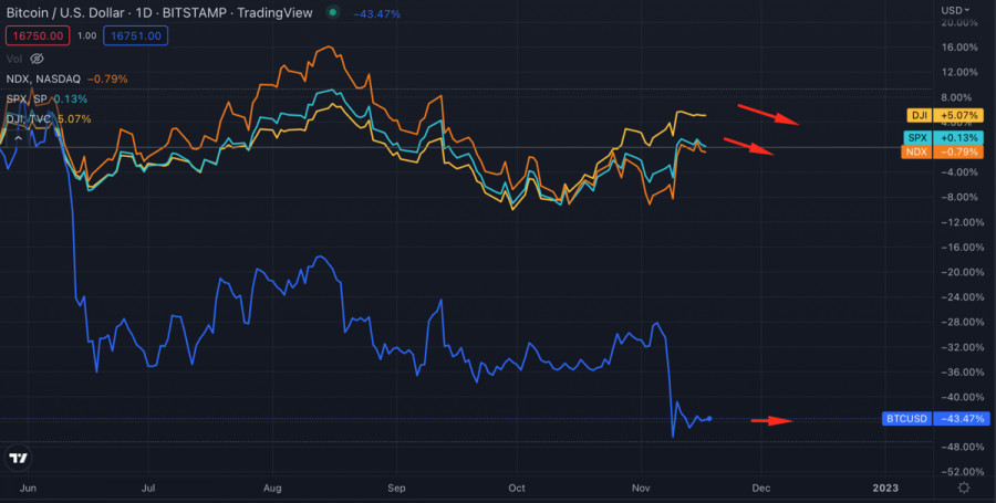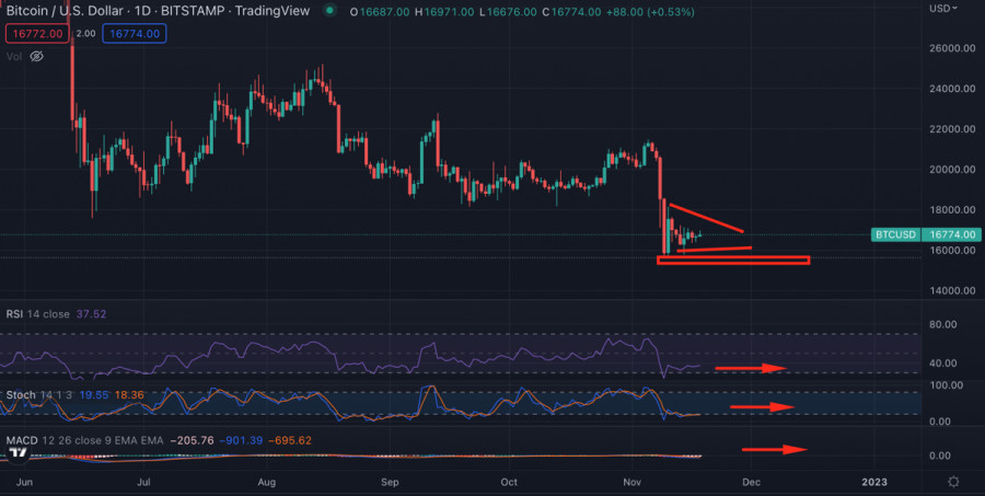 Стоит ли ждать снижения цены Биткоина на выходных?ИнстаФорекс - Instaforex, 2 года назад Текущая торговая неделя не принесла на рынок новых потрясений, а инвесторы продолжали разбирать завалы и последствия краха FTX. За последние 5 дней стало понятно, что доверие к криптоиндустрии подорвано, а томление на локальном дне может длиться дольше. За последние 7 дней из централизованных криптобирж было выведено более 105 000 BTC. Вероятно, эта тенденция сохранится на протяжении нескольких последующих недель. Торговая неделя также завершается неопределенностью из-за ситуации вокруг Genesis и Gemini, у которых проблемы с ликвидностью. Волатильность на крипторынке стабилизировалась, а большинство монет движутся в новых диапазонах вблизи локальных минимумов. Однако ситуация может измениться на выходных при наличии хотя бы одной существенной искры. Варианты развития событийБиткоин и крипторынок могут последовать в трех известных направлениях: на север, на дно и в боковом направлении. Вероятность флетового движения высока, так как инвесторы заняты спасением своих капиталов, а не телодвижениями на рынке. Существует вероятность восстановления Биткоина выше $17,2k, где проходит текущий уровень сопротивления. Соотношение лонгов и шортов на ряде криптобирж свидетельствует о желании покупателей вытолкнуть цену выше $17k. Однако учитывая количество и результат рыночных манипуляций за последние три недели, есть все основания полагать, что толпа вновь окажется обманутой. Очередное обновление локального дна на выходных выглядит реалистичным при условии наличия фундаментальных новостей. Если на выходных окажется, что Genesis или Gemini, или другая неожиданная жертва краха FTX заявит о банкротстве, то всплеск волатильности позволит медведям реализовать очередной дамп к области $14k-$14,5k. Анализ BTC/USDЦена Биткоина продолжает сжиматься в фигуру "треугольник" при падающем уровне волатильности. Это классический паттерн за которым последует импульсный выход цены в одном из направлений. Технические метрики указывают на то, что криптовалюта продолжит движение по флету и завершит формирование треугольника в ближайшие 5-7 дней. Также вероятно укрепление корреляции между фондовыми индексами и Биткоином. Локальный восходящий тренд рынка акций приближается к паузе, и вероятность коррекции индексов способна укрепить их связь с Bitcoin. Учитывая это, можно ожидать более живой реакции криптовалюты на события фондового рынка. Индекс доллара США также продолжает двигаться по флету без предпосылок к очередному бычьему забегу. Учитывая движение DXY во время предыдущих циклов, актив достиг своей пиковой точки, и ожидать существенного влияния индекса на котировки Биткоина не стоит. Ончейн-активность BitcoinПосле пиковых показателей несколько дней назад, когда цена BTC в очередной раз тестировала уровень $15,8k, объемы торгов и число уникальных адресов в сети криптовалюты резко упали. При отсутствии форс-мажоров и "черных лебедей" показатели сетевой активности BTC продолжат снижаться. ИтогиНа рынке царит затишье после серьезного удара по всей индустрии и тотального вывода средств. Биткоин проведет выходные в рамках узкого диапазона без значительных ценовых движений. В то же время нельзя исключать как позитивные, так и негативные факторы для движения цены. При всплеске волатильности и резко
