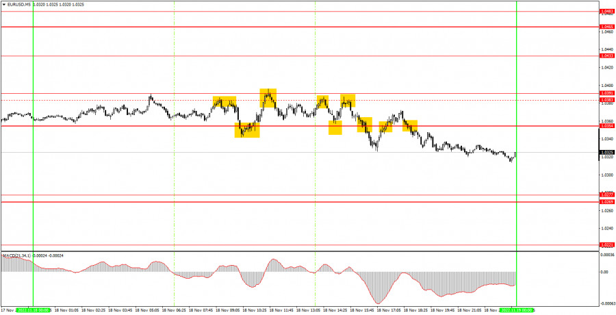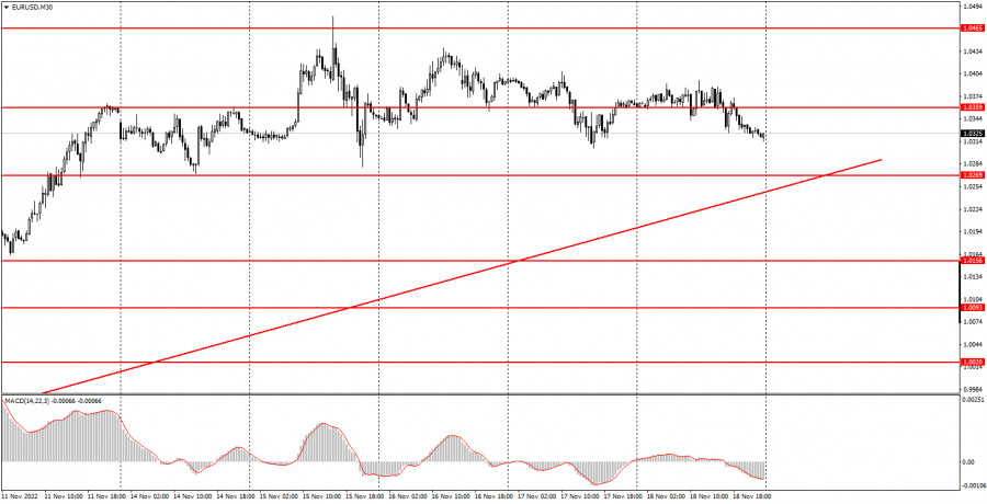 Итоги 18 ноября и недели. Простые советы и разбор сделок для новичков.ИнстаФорекс - Instaforex, 2 года назад Разбор сделок пятницы:30M график пары EUR/USD.Валютная пара EUR/USD в пятницу, как и на всей неделе, торговалась довольно невзрачно. На иллюстрации выше отлично видно, что всю неделю пара находилась между уровнями 1,0269 и 1,0465. В отдельные дни наблюдался откровенный флэт. В общем и целом, движение пары на этой неделе нельзя назвать флэтом, но все же его характер куда больше похож на флэт, чем на тренд. В пятницу преобладал минимальный нисходящий уклон движения, но восходящая линия тренда остается актуальной, а значит сохраняется восходящая тенденция. К сожалению, если боковое движение сохранится, то цена легко и просто может преодолеть линию тренда, но это не будет означать начало новой нисходящей тенденции. Важных фундаментальных событий на этой неделе было немного, да и те были проигнорированы, по большому счету. В пятницу в США не было абсолютно ничего интересного, а в Евросоюзе состоялось выступление главы ЕЦБ Кристин Лагард, которая заявила, что ставки будут продолжать расти до уровней, ограничивающих экономический рост. Это нужно, чтобы продолжать оказывать давление на высокую и продолжающую расти инфляцию. Однако ничего нового госпожа Лагард не заявила и рынок никак не отреагировал на ее выступление. 5M график пары EUR/USD.На 5-минутном таймфрейме еще лучше видно, что в пятницу пара большую часть дня находилась в откровенном флэте, между уровнями 1,0354 и 1,0391. Только на европейской сессии и в начале американский было сформировано семь торговых сигналов в этом диапазоне. Естественно, торговать во флэте не рекомендуется, но понять, что начался флэт, можно далеко не всегда быстро и оперативно. Поэтому некоторые сигналы начинающие трейдеры могли попытаться отработать. Что интересно, из первых семи сигналов практически ни один нельзя назвать откровенно ложным, потому что цена более или менее точно отрабатывала указанные выше уровни и практически каждый раз достигала ближайшего целевого уровня. Поэтому по практически любой сделке можно было получить прибыль 5-10 пунктов. По сигналу о закреплении ниже уровня 1,0354 заработать не удалось, но и убытка не было, так как необходимые для выставления Stop Loss в безубыток 15 пунктов вниз были пройдены. В итоге в пятницу можно было получить небольшую прибыль методом «пипсовки». Основные правила торговой системы:1) Сила сигнала считается по времени, которое потребовалось на формирование сигнала(отскок или преодоление уровня). Чем меньше времени потребовалось, тем сильнее сигнал. 2) Если около какого-либо уровня были открыты две или больше сделки по ложным сигналам, то все последующие сигналы от этого уровня следует игнорировать. 3) Во флэте любая пара может формировать массу ложных сигналов или же не формировать их вовсе. Но в любом случае при первых признаках флэта лучше переставать торговать. 4) Торговые сделки открываются во временной период между началом европейской сессии и до середины американской, когда все сделки должны быть закрыты вручную. 5) На 30-минутном ТФ по сигналам от индикатора MACD можно торговать только при наличие хорошей волатильности и тренда, который подтверждается линией тренда или трендовым каналом. 6) Если два уровня расположены слишком близко друг к другу(от 5 до 15 пунктов), то следует ра