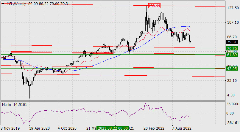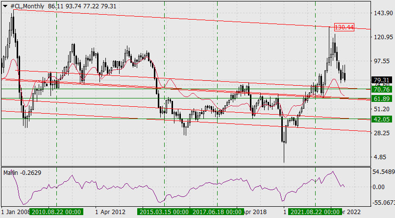 Среднесрочные перспективы нефтиИнстаФорекс - Instaforex, 2 года назад Рассмотрим ситуацию на графике месячного масштаба. После формирования пика цены в марте текущего года на уровне 130.44, цена образовала верхнюю границу нисходящего глобального гиперканала, и теперь котировка приближается к вложенной линии этого канала на уровне 70.76. Данный уровень соответствует минимуму августа 2010 года. Осциллятор Марлин уже переместился на территорию понижающейся тенденции (текущее значение на графике -0.2629), впереди у него может быть большой путь вниз. В среднесрочной перспективе можно ожидать, что преодоление поддержки 70.76 открывает путь к следующей вложенной линии ценового канала 61.89, уровень соответствует минимуму августа 2021 года.