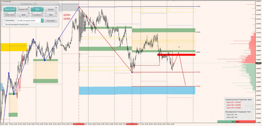 Среднесрочная тенденция: в шорт. Максимальное скопление объемов среднесрочной тенденции расположено в диапазоне по котировкам 0.67683-0.67773. В настоящий момент по паре совершаются инвестиционные операции ниже, указывая на силу продавцов.