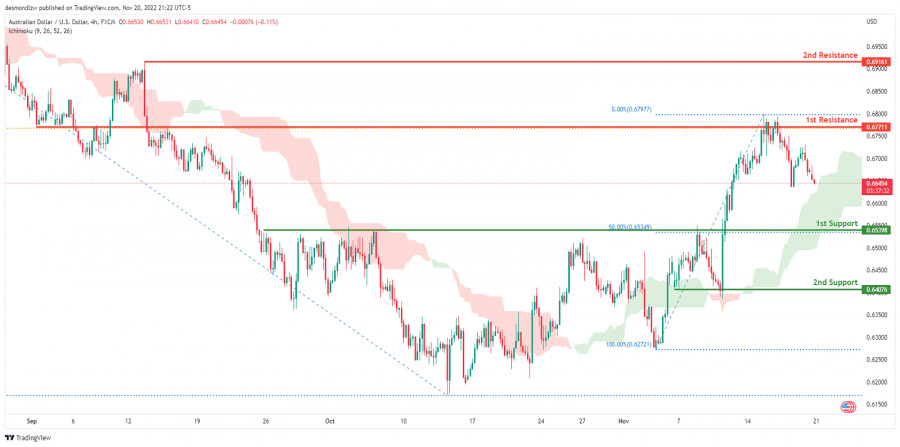 AUD/USD развивает бычий импульс. Прогноз на 21 ноября 2022ИнстаФорекс - Instaforex, 2 года назад На 4-часовом графике пара AUD/USD торгуется выше облака Ишимоку, что указывает на бычий импульс. Ожидается, что цена может пробить 1-й уровень сопротивления 0.67711, соответствующий уровню коррекции Фибоначчи 61.8%, а затем направиться ко 2-му уровню сопротивления 0.69161, который соответствующий предыдущему уровню свинг-хай. В качестве альтернативы цена может упасть до 1-го уровня поддержки 0.65398, соответствующего 50% уровню Фибоначчи. Торговая рекомендация Вход: 0.65398 Условия для входа: 1-й уровень поддержки Тейк-профит: 0.67711 Условия для фиксации прибыли: 1-й уровень сопротивления и предыдущий уровень свинг-хай Стоп-лосс: 0.64076 Условия для активации ордера стоп-лосс: предыдущий уровень свинг-лоу и 2-й уровень поддержки Материал предоставлен компанией InstaForex - www.instaforex.com |