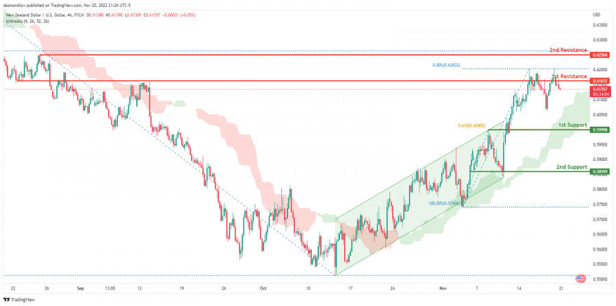 NZD/USD торгуется с бычьим настроем. Прогноз на 21 ноября 2022ИнстаФорекс - Instaforex, 2 года назад На 4-часовом графике пара NZD/USD пробила восходящий канал и сейчас движется выше облака Ишимоку. Если бычий импульс сохранится, цена может пробить 1-й уровень сопротивления 0.61632, соответствующий предыдущему уровню свинг-хай и уровню коррекции Фибоначчи 0%, и затем направиться ко 2-му уровню сопротивления 0.62504, который соответствует уровню коррекции Фибоначчи 78.6%. В качестве альтернативы цена может вернуться к 1-му уровню поддержки 0.59998, где расположена проекция Фибоначчи 61.8%. Торговая рекомендация Вход: 0.61565 Условия для входа: 1-й уровень сопротивления Тейк-профит: 0.59998 Условия для фиксации прибыли: 1-й уровень поддержки и проекция Фибоначчи 61.8% Стоп-лосс: 0.62504 Условия для активации ордера стоп-лосс: 2-й уровень сопротивления и предыдущий уровень свинг-хай Материал предоставлен компанией InstaForex - www.instaforex.com |