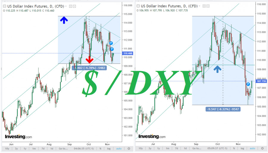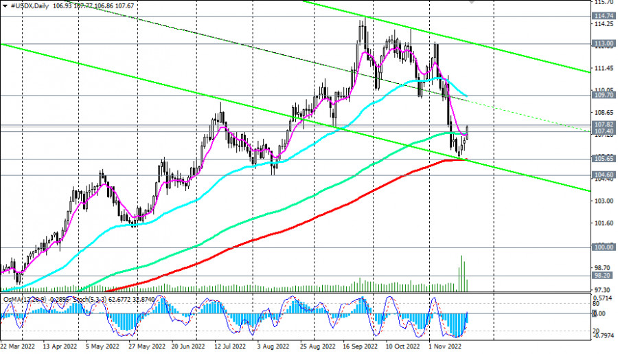 DXY: накануне предрождественского периодаИнстаФорекс - Instaforex, 2 года назад Сегодняшний торговый день начался наступлением доллара. Фьючерсы на индекс доллара DXY также открыли сегодняшний торговый день небольшим гэпом вверх после неуверенного роста в предыдущие 3 торговых дня. На момент публикации данной статьи фьючерсы DXY торговались по цене 107.74, на 79 пунктов выше цены открытия сегодняшнего торгового дня и на 88 пунктов выше цены закрытия в минувшую пятницу. Прошедшую неделю индекс доллара завершил с небольшим символическим приростом в 17 пунктов. Инвесторы все еще находятся под впечатлением разочаровавших их данных по потребительской инфляции, указавшие на замедление ее роста. Так, индекс потребительских цен (CPI) снизился в октябре с 8,2% до 7,7% (в годовом исчислении), сильнее прогноза о снижении к 8,0%. Базовый (Core) CPI скорректировался до 6,3% против прогноза 6,5% (также в годовом исчислении) и 6,6% в прошлом месяце. Определенно усилия ФРС по сдерживанию инфляции в США приносят результаты. Это повышает вероятность того, что темпы ужесточения монетарной политики в скором времени могут быть снижены. До публикации этих инфляционных индикаторов широко ожидалось, что на заседании в декабре (13 и 14 декабря) процентная ставка вновь будет повышена на 0,75% (до 4,75%). Но вот со стороны некоторых представителей руководства ФРС уже прозвучали осторожные заявления о том, что в ближайшей перспективе возможно замедление темпов ужесточения монетарной политики, хотя инфляция, по их утверждению, остается еще слишком высокой, а для ее возращения к целевому уровню 2,0% предстоит ещё большая работа. Таким образом, вероятность повышения ставки ФРС на 75 базисных пунктов в декабре снизилась. Наоборот, теперь участники рынка, согласно данным CME Group, закладывают в цены 80% вероятность повышения процентной ставки ФРС в декабре на 50 б.п. В одном из наших недавних обзоров DXY: о чем скажут «свежие» данные по инфляции? мы предположили, что «если публикация инфляционных показателей США разочарует инвесторов, то это спровоцирует новую волну распродаж доллара и падение DXY в сторону отметки 109.00». На тот момент фьючерсы DXY торговались вблизи отметки 110.46, сохраняя негативную динамику и двигаясь в нижней части вновь образовавшегося в прошлом месяце нисходящего канала (на графике DXY). Пробой этих уровней может спровоцировать более глубокое падение DXY, вплоть до ключевых уровней поддержки 107.40, 105.65. Собственно говоря, это и произошло: цена пробила нижнюю границу нисходящего канала на графике DXY на отметке 109.00 и достигла в последующие 3 дня локального минимума 105.15. Тем не менее вблизи этого локального минимума силы продавцов доллара иссякли, и к настоящему моменту, как мы отметили выше, индекс доллара DXY поднялся к отметке 107.74. Если взглянуть на дневной график индекса доллара (в торговом терминале МТ4 он отображается как CFD #USDX), то хорошо видно, что цена не смогла пробить ключевой уровень поддержки 105.65 (ЕМА200), и в последующие 4 дня цена, отскочив от этого уровня, росла, предпринимая на текущий момент попытку пробоя в зону выше долгосрочного уровня 107.40 (ЕМА144 на дневном графике CFD #USDX). В нашем предыдущем обзоре DXY: в ожидании сигнала. На покупку? мы писали, что «выше ключевого уровня поддержки 105.65 индекс доллара остается в зоне долгосрочного бычьего рынка. При появлении же сигналов на покупку пр