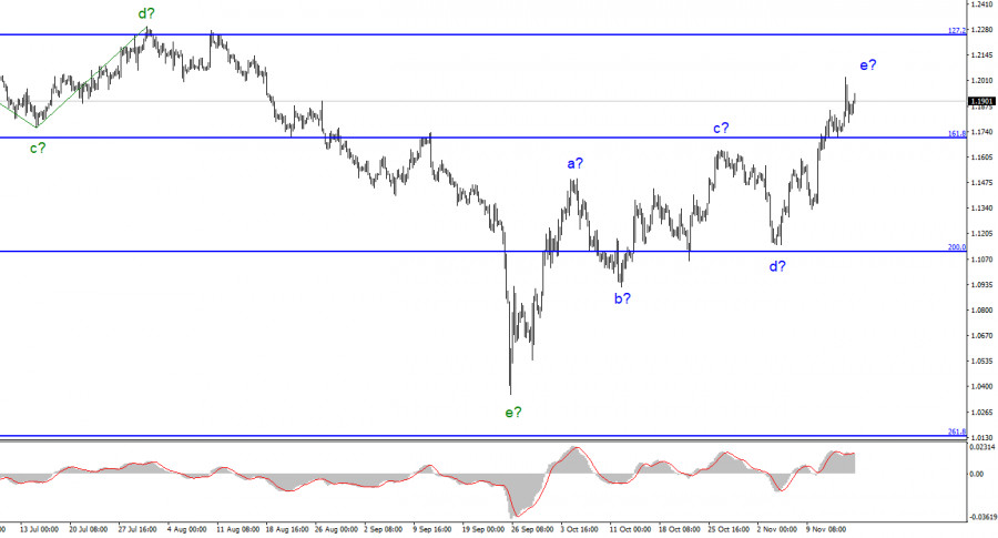 Анализ GBP/USD. 21 ноября. У британца два пути: простой и сложныйИнстаФорекс - Instaforex, 2 года назад По инструменту Фунт/Доллар волновая разметка на данный момент выглядит довольно сложно, но все еще не требует внесения уточнений. Мы имеем предположительно завершенный нисходящий участок тренда, который состоит из пяти волн a-b-c-d-e. Также мы имеем пяти волновой повышательный участок тренда, который принял вид a-b-c-d-e. Таким образом, я думаю, что повышение котировок инструмента может продолжаться еще некоторое время, но это будет волновой рост и вряд ли долгий. Новостной фон за последнее время можно было трактовать в любую сторону, так как оба центральных банка подняли свои процентные ставки, а в позапрошлую пятницу мы увидели падение доллара на том новостном фоне, который вполне мог привести к его новому росту (отчет Nonfarm Payrolls). Все это наводит меня на мысль, что рынок решил достроить полноценную пяти волновую структуру, после чего будет принимать решение о построении нового понижательного участка тренда. Удачная попытка прорыва отметки 1,1704, что приравнивается к 161,8% по Фибоначчи, указывает на незавершенность повышательного участка тренда, но в целом волновая структура выглядит полностью укомплектованной. Британец уже не может двигаться вверх.Курс инструмента Фунт/Доллар в течение 21 ноября снизился на 75 базовых пунктов, но амплитуда движений сегодня была достаточно низкой. Новостной фон в Великобритании сегодня отсутствует, в США – тоже ничего интересного не будет. Таким образом, 75 пунктов снижения инструмента, это еще очень хорошо для американской валюты, которая в последнее время испытывает серьезные проблемы с ростом. Как я уже говорил, волновая разметка выступает сейчас в пользу построения нового понижательного участка тренда. Пусть это будет трех волновой участок, но он должен быть построен, чтобы волновая картина сохраняла свою целостность. Напомню, что волновая разметка может принимать практически любой вид, а любая структура может удлиняться и усложняться любое количество раз. В этом минус волн, так как далеко не всегда получается точно спрогнозировать, как будет двигаться инструмент. В то же время прямо сейчас нет оснований для ожидания усложнения картины. Причин у рынка повышать спрос на доллар сейчас не очень много, но и увеличивать спрос на фунт их тоже нет. Я думаю, что в конечном итоге волны все же победят и мы увидим снижение инструмента. Этот путь легкий, понятный и логичный. Сложный путь заключается в том, что спрос на британца продолжит расти. Пока это повышение будет укладываться в рамки предполагаемой волны e. Эта волна может принять и гораздо более протяженный вид, чем сейчас, но после ее завершения, которое рано или поздно произойдет, все равно должен быть построен нисходящий участок минимум на три волны. А спрос на доллар должен увеличиваться, чтобы волновая разметка не стала похожей на последний понижательный тренд, когда в лучшем случае мы видели по одной коррекционной волне вверх после каждой пятиволновки вниз. Общие выводы.Волновая картина инструмента Фунт/Доллар предполагает построение нового понижательного участка тренда, но начаться он может немного позже. Покупки инструмента я уже посоветовать не могу, так как волновая разметка допускает начало построения нисходящего участка тренда уже сейчас. Спро