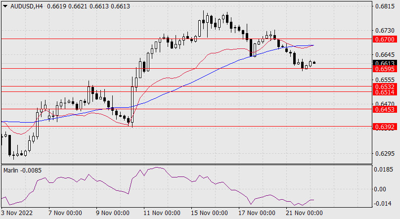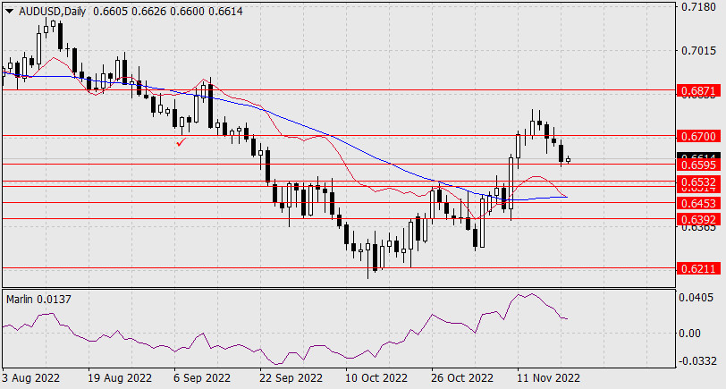Прогноз по AUD/USD на 22 ноября 2022 годаИнстаФорекс - Instaforex, 2 года назад В понедельник австралийский доллар снизился на 66 пунктов, отработав нижней тенью дневной свечи целевую поддержку 0.6595. сегодня утром цена слегка корректирует вверх, но настрой, согласно снижающемуся осциллятору Марлин, сохраняется понижающимся. Преодоление уровня 0.6595 откроет целевой диапазон 0.6514/32. Диапазон соответствует максимумам широкодиапазонной консолидации последних чисел сентября – первых чисел октября.