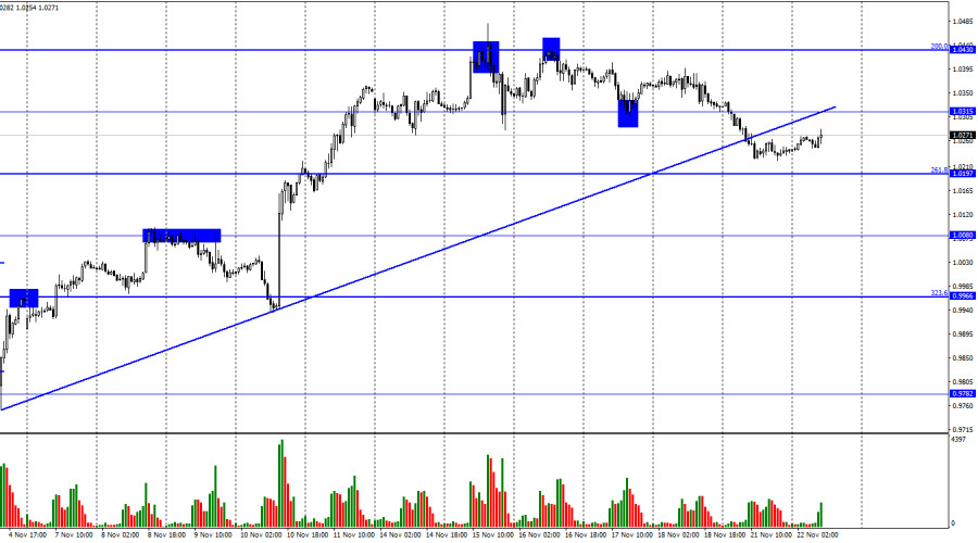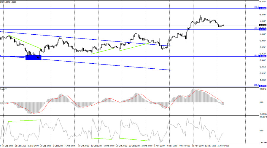 EUR/USD. 22 ноября. Доллар уже учел фактор замедления повышения ставки ФРСИнстаФорекс - Instaforex, 2 года назад Добрый день, уважаемые трейдеры! Пара EUR/USD в понедельник продолжала процесс падения и выполнила закрепление под восходящей трендовой линией. Таким образом, настроение трейдеров на часовом графике изменилось на «медвежье», а пара может продолжить процесс падения в направлении уровня коррекции 261,8% - 1,0197. Вчерашний день не дал трейдерам никакой новой и важной информации. Несмотря на то что в течение дня пара не торговалась горизонтально, что могло бы означать наличие фона, все-таки важных новостей не было никаких. Впрочем, все зависит от того, что считать важной новостью. Трейдеры далеко не в каждом отдельно взятом случае реагируют на отчет или выступление какого-нибудь значимого лица в мире экономики. Вчера стало известно, что президент ФРБ Сан-Франциско поддерживает замедление темпов ужесточения ДКП, но для кого подобные слова сейчас являются новостью? Уже большая часть всего монетарного комитета заявила, что рост процентной ставки нужно замедлять. Таким образом, на декабрьском заседании ФРС она, вероятно, вырастет на 0,50%, что трейдерам тоже уже давно известно. Я предполагаю, что в последние несколько недель, когда доллар активно падал, трейдеры как раз отрабатывали фактор замедления темпов роста ставки, которое произойдет в ближайшем будущем. Если так, то этот фактор уже отработан, а значит, у валюты США нет особых причин продолжать падение. Закрепление курса пары под линией тренда также показывает, что медведи могут вернуться на рынок. Европейская валюта на этой неделе вполне может упасть на 200-300 пипсов. Сегодня, во вторник, информационного фона больше не станет, поэтому движение пары в любую сторону может быть достаточно медленным. Возможен даже рост к уровню 1,0315, а отбой от него сработает в пользу американской валюты и возобновления падения в направлении 1,0197 и ниже. На 4-часовом графике пара выполнила закрепление над уровнем коррекции 127,2% - 1,0173, однако на данный момент находится в процессе возврата к этому уровню. Отбой от него сработает в пользу валюты ЕС и возобновления роста в направлении коррекционного уровня 100,0% - 1,0638. Закрепление под 1,0173 повысит вероятность дальнейшего падения евро в направлении уровня Фибо 161,8% - 0,9581. Отчет Commitments of Traders (COT):