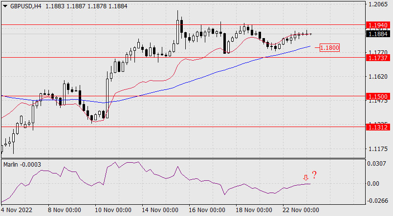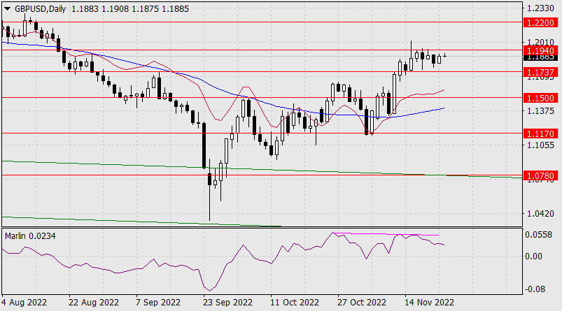 Прогноз по GBP/USD на 23 ноября 2022 годаИнстаФорекс - Instaforex, 2 года назад Вчера индекс доллара снизился на 0,60%. Последовавший за ним фунт подрос на 62 пункта. На дневном графике развитие цены последних 5 дней выглядит как консолидация в диапазоне целевых уровней 1.1737-1.1940. Осциллятор Марлин дневного масштаба развивает продвижение вниз. Прорыв цены к ближайшей поддержке 1.1737 уже назрел. Закрепление под уровнем открывает цель 1.1500.