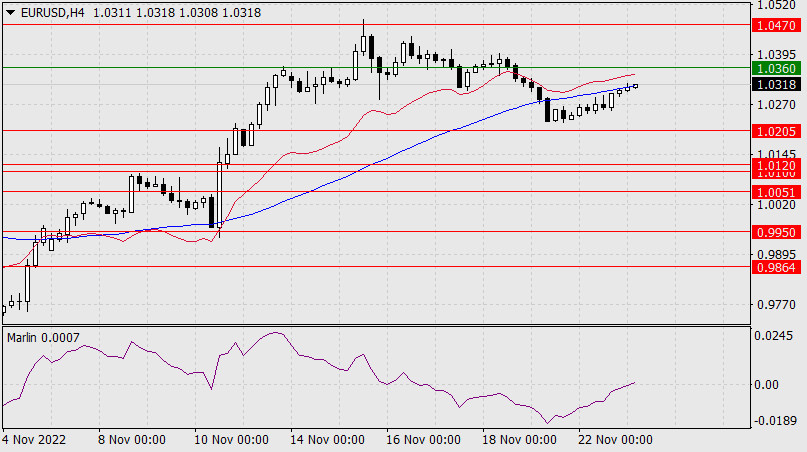 Прогноз по EUR/USD на 23 ноября 2022 годаИнстаФорекс - Instaforex, 2 года назад Во вторник евро коррекционно подрос на 63 пункта, но этот рост выглядит чрезмерным на фоне готовящегося уже сегодня странами G-7 потолка цен на российскую нефть и публикации протокола с последнего ястребиного заседания ФРС. Осциллятор Марлин дневного масштаба слабо отреагировал на вчерашний рост, сегодня утром он уже снижается. Вероятно, рост завершился и теперь с новыми силами цена направится к 1.0205.
