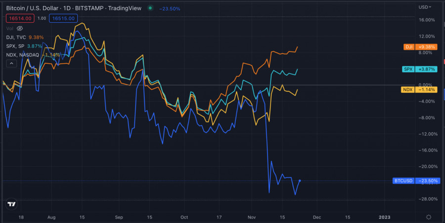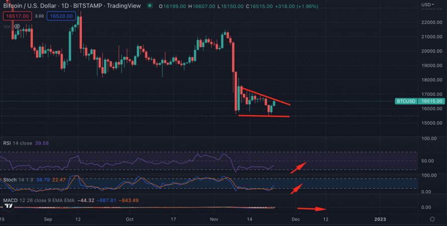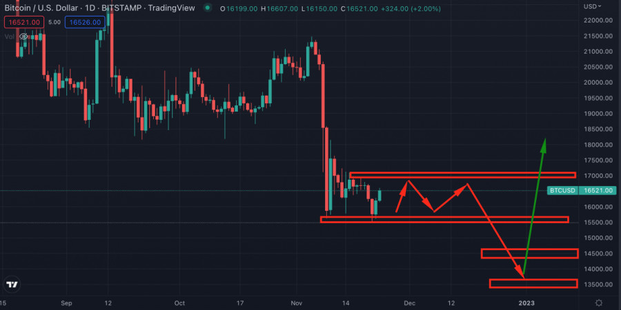 Биткоин восстановился выше $16k благодаря активности покупателей: чего ждать от криптовалюты дальше?ИнстаФорекс - Instaforex, 2 года назад За последние несколько недель рынок криптовалют наводнили негативные новости, которые способствуют массовой капитуляции инвесторов. Это, в свою очередь, влияет на движение цены Bitcoin и остальных криптовалют. Негативные факторыВероятное банкротство Genesis и отказ Binance помогать компании спровоцировали очередную волну страха на рынке. Руководство криптоброкера опубликовало отчетность, где числится $2,8 миллиардов не погашенных кредитов. Часть задолженности возникла вследствие банкротства Three Arrows Capital. Помимо этого, продолжается массовая капитуляция майнеров, которая оказывает негативное влияние на цену Биткоину. По сообщениям Glassnode, за день компании по добыче Bitcoin распродают минимум 310 монет BTC. В отчетности майнинг-гиганта Core Scientific Inc говорится, что компания потеряла $1,7 миллиарда в 2022 году и тем самым подтверждает большие проблемы майнинг-индустрии. Позитивные факторыНесмотря на весь негатив вокруг крипторынка, начали появляться позитивные сигналы. Чиновники ФРС заявили, что видят основания для замедления темпов повышения ставки. Ожидается, что во время декабрьского заседания показатель будет повышен на 0,5%. При этом регулятор будет реагировать в соответствии с динамикой снижения инфляции. Чиновники допустили, что граничный порог в 5% будет повышен в случае неутешительной статистики в ближайшие месяцы. Новогоднее ралли на крипторынке?Заявление ФРС было воспринято рынками с воодушевлением и верой в завершение фазы количественного сокращения. Рынок акций и криптовалюты также отреагировали локальным ростом. Помимо туманных среднесрочных перспектив, для крипторынка вырисовывается и краткосрочные благоприятные события. Рынки закладывают практически 100% вероятность повышения ставки на 50 базисных пунктов в декабре. Это позитивный сигнал, свидетельствующий о первых успехах борьбы с инфляцией. Помимо этого, важно учитывать фактор новогодних и рождественских праздников, когда настроения инвесторов улучшаются и прямо влияют на рынок. Учитывая эти факторы, можно предположить, что ноябрь станет финальной точкой в формировании локального дна Биткоина. Впоследствии нас ждет восходящий отскок и, вероятно, локальный бычий тренд. Однако вероятность восстановительного движения будет зависеть от возобновления корреляции с рынком акций. Анализ BTC/USDНа дневном графике мы видим, что быкам удалось защитить область поддержки $15,5k-$15,8k. Цена протестировала рубеж, но впоследствии покупателям удалось оттеснить медведей. По состоянию на 12:00 криптовалюта торгуется в районе $16,5k и постепенно движется к зоне сопротивления $17k-$17,2k. Восстановительное движение цены было спровоцировано заявлениями членов ФРС, однако кардинального изменения ситуации ждать не стоит. Цена продолжает двигаться от верхней границы диапазона к нижней и наоборот. Учитывая недостаток сил быков, стоит ожидать повторного ретеста $15,5k-$15,8k. ИтогиСовокупность фундаментальных и ончейн-факторов указывает на формирование нового локального дна с последующим импульсным отскоком. Текущее состояние рынка вынуждает полагать, что для финального погружения понадобится серьезный негативный фактор. Новостное и техническое затишье Биткоина провоцир