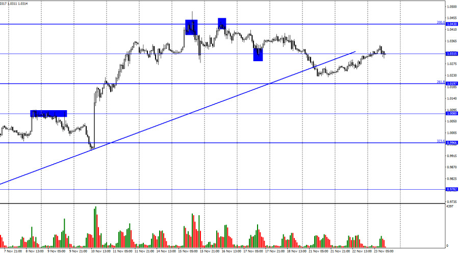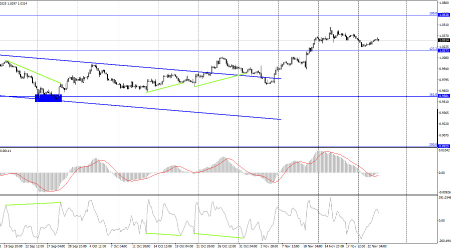 EUR/USD. 23 ноября. Индексы деловой активности в ЕС: ноль реакцииИнстаФорекс - Instaforex, 2 года назад Добрый день, уважаемые трейдеры! Пара EUR/USD во вторник продолжала процесс роста, начавшийся сутками ранее. Было выполнено закрытие над уровнем 1,0315, которое немного повышает вероятность дальнейшего роста евровалюты в направлении следующего уровня коррекции 200,0% - 1,0430. Однако, на мой взгляд, более важным является закрепление котировок под восходящей трендовой линией, что значительно повышает вероятность дальнейшего падения пары. И текущий рост не должен смущать трейдеров, он совсем не означает, что уже сегодня или завтра пара не возобновит процесс падения. Сегодня в Евросоюзе были опубликованы абсолютно пресные индексы деловой активности. В секторе услуг значение в ноябре не изменилось и составило 48,6. В секторе производства – увеличилось с 46,4 до 47,3. Композитный индекс деловой активности вырос с 47,3 до 47,8. Однако эти увеличения не могут и не могли вызвать рост европейской валюты по одной простой причине: все три индекса находятся ниже уровня 50,0, ниже которого любое значение считается негативным для экономики. Таким образом, минимальное увеличение двух из трех показателей не являлось основанием для роста евро. И мы получаем ровно ту же информационную картину, что и в понедельник со вторником. Практически отсутствующую информационную картину, потому что важных событий и новостей по-прежнему нет. Напомню, что наиболее важными событиями последних дней были выступления представителей FOMC, которые заявили, что в декабре ставка ФРС продолжит расти, но уже медленнее, чем раньше. Именно такой вариант рассчитывают увидеть сейчас и трейдеры, поэтому можно предположить, что он уже учтен в текущему курсе пары. Таким образом, у трейдеров сейчас нет событий, которые можно было бы отработать или на основании которых можно было скорректировать торговую стратегию. На 4-часовом графике пара выполнила закрепление над уровнем коррекции 127,2% - 1,0173, однако на данный момент находится в процессе возврата к этому уровню. Отбой от него сработает в пользу валюты ЕС и возобновления роста в направлении коррекционного уровня 100,0% - 1,0638. Закрепление под 1,0173 повысит вероятность дальнейшего падения евро в направлении уровня Фибо 161,8% - 0,9581. Отчет Commitments of Traders (COT):