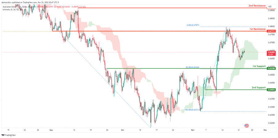 AUD/USD развивает медвежий импульс. Прогноз на 23 ноября 2022ИнстаФорекс - Instaforex, 2 года назад На 4-часовом графике пара AUD/USD торгуется ниже облака Ишимоку, что указывает на медвежий импульс. Ожидается, что цена может упасть до 1-го уровня поддержки 0.65398, который соответствует уровню коррекции Фибоначчи 50%. В качестве альтернативы цена может пробить 1-й уровень сопротивления 0.67711, соответствующий уровню коррекции Фибоначчи 61.8%, и затем направиться ко 2-му уровню сопротивления 0.69161, который соответствует предыдущему уровню свинг-хай. Торговая рекомендация Вход: 0.65398 Условия для входа: 1-й уровень поддержки Тейк-профит: 0.67711 Условия для фиксации прибыли: 1-й уровень сопротивления и предыдущий уровень свинг-хай Стоп-лосс: 0.64076 Условия для активации ордера стоп-лосс: предыдущий уровень свинг-лоу и 2-й уровень поддержки Материал предоставлен компанией InstaForex - www.instaforex.com |