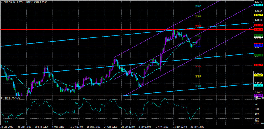 Обзор пары EUR/USD. 24 ноября. То ли флэт, то ли алогичный рост.ИнстаФорекс - Instaforex, 2 года назад Валютная пара EUR/USD в среду вновь показала такое движение, которое очень сложно сочетается с тем макроэкономическим фоном, который был в распоряжении трейдеров. Практически весь день пара находилась в восходящем движении, хотя если подробно рассмотреть макроэкономическую статистику, то пара должна была в течение дня и падать, и расти попеременно. Утром в Евросоюзе вышли индексы деловой активности в секторах услуг и производства. Даже не обращая внимания на тот факт, что отклонения от прогнозных значений и от значений предыдущего месяца были минимальными, все три индекса оказались ниже ключевого уровня, «ватерлинии» 50,0. Таким образом, их в любом случае нельзя было рассматривать, как положительные для евровалюты. Далее, в США были опубликованы свои индексы деловой активности, которые тоже либо снизились под «ватерлинию», либо просто остались под ней. Поэтому и у доллара не было никаких оснований показывать рост. Но почему-то доллар упал, а евровалюта нет. Также в Штатах были опубликованы и другие отчеты, в частности заказы на товары долгосрочного использования. Хоть мы и не считаем этот отчет важным, но все же хоть какая-то реакция могла последовать и на него, тем более что его значение оказалось выше прогнозов. Поэтому получилась ситуация, при которой все негативные для евровалюты отчеты были проигнорированы, а все позитивные для нее – отработаны. Мы уже говорили неоднократно за последние полторы недели, что весь рост евровалюты в принципе не соответствует «фундаменту». Одного факта снижения инфляции в США явно мало, чтобы доллар терял свои позиции сотнями пунктов. Тоже самое касается и риторики некоторых членов ФРС, которые заявили, что в декабре ставка может начать расти более медленно. Но она все равно будет продолжать расти еще несколько месяцев!!! Более того, рынок почему-то не учитывает слова Джерома Пауэлла о том, что ставка может расти в итоге дольше, чем предполагалось ранее. Ведь это уже «ястребиный» фактор! Но, как уже было сказано, рынок усердно игнорирует все «бычьи» факторы для доллара. Единственное основание для укрепления евровалюты сейчас – это техническая картина на 24-часовом ТФ. Так как цена преодолела все линии индикатора Ишимоку, то может продолжать формирование нового восходящего тренда. Что же со всем этим делать? Так как пара вернулась в область выше скользящей средней линии, то сейчас на 4-часовом ТФ опять восходящая тенденция. Таким образом, торговать нужно на повышение, но при этом помнить, что этот рост нелогичен. Пара может просто консолидироваться после длительного нисходящего тренда. Если это так, то обязательно последует и нисходящая консолидация, которая тоже может выглядеть вполне нелогично. Мы вступаем в фазу нелогичных движений на рынке. Также мы готовы предположить, что движения последних дней – это флэт. Он может протекать между уровнями 1,0230 и 1,0450. Пока что еще сложно сделать подобный вывод наверняка, но при этом вероятность этого тоже существует. Флэт или «качели». Средняя волатильность валютной пары евро/доллар за последние 5 торговых дней по состоянию на 24 ноября составляет 89 пунктов и характеризуется, как «средняя». Таким образом, мы ожидаем движение пары между уровнями 1,0266 и 1,0445 в четверг. Разв