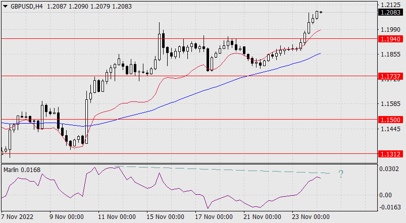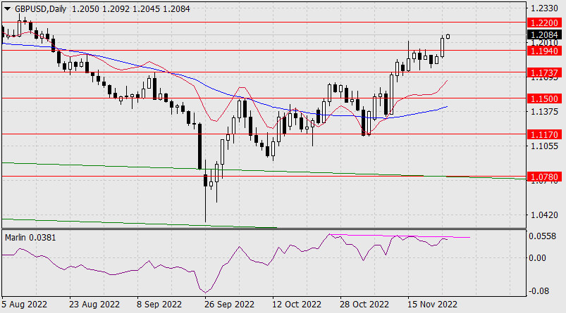 Прогноз по GBP/USD на 24 ноября 2022 годаИнстаФорекс - Instaforex, 2 года назад Вчерашний рост британского фунта на 1,42% вывел его в лидеры дня (хотя абсолютным лидером стал новозеландский доллар, подросший на 1,55% по причине повышения ставки РБНЗ на 0,75%), но техническая составляющая указывает на то, что растущий потенциал фунта иссяк. На графике дневного масштаба цена с осциллятором Марлин формируют уже двойную дивергенцию. Конечно, альтернативный вариант с выходом над 1.2200, с закреплением над уровнем и дальнейшим ростом, как любая альтернатива, существует, поэтому с практической стороны дела рекомендуется дождаться подтверждение какого-либо развития событий. Вероятность разворота с уходом цены под 1.1940 около 65%.