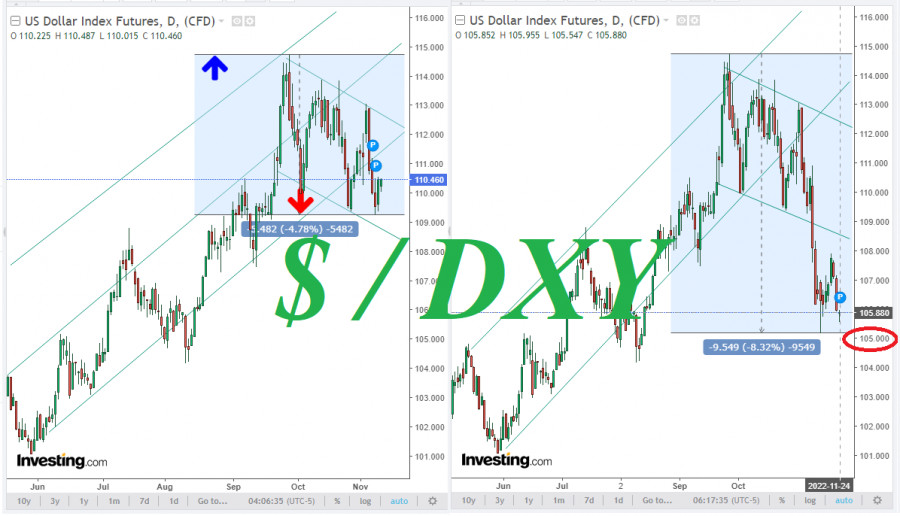 DXY: доллар. Ближайшая перспективаИнстаФорекс - Instaforex, 2 года назад В четверг доллар продолжает оставаться под давлением после публикации в среду индексов деловой активности PMI в США, указавших на ее замедление в ноябре. Как следует из отчета S&P Global Market Intelligence, индекс деловой активности в производственном секторе США упал в ноябре до 47.6 с 50.4 в октябре, что также оказалось хуже прогноза 50. "Снижению основного показателя способствовало возобновление падения объемов производства и более резкое сокращение новых заказов", - прокомментировали в S&P Global, добавив также, что "в таких условиях инфляционное давление должно продолжать снижаться в ближайшие месяцы, причем потенциально значительно, а экономика тем временем продолжает углубляться в вероятную рецессию". "Согласно предварительным данным исследования PMI, темпы падения производства и спроса увеличились, что соответствует сокращению экономики на 1% в годовом исчислении", - отметили также в S&P Global. Деловая активность в секторе услуг США также продолжала сокращаться ускоряющимися темпами в начале ноября: индекс деловой активности S&P Global Services PMI упал до 46.1 с 47.8 в октябре, хуже прогноза в 47.9. Как сообщили в S&P Global Market Intelligence, «объем новых заказов в ноябре сократился значительными темпами. Второе подряд ежемесячное снижение объема новых заказов стало самым резким с мая 2020 года". Негативное настроение инвесторов в среду также усугубил еженедельный отчет Минтруда США: число первичных заявок на пособие по безработице составило 240 000, оказавшись хуже ожиданий рынка в 225 000 и 223 000 неделей ранее. Этот блок негативной макро статистики повлиял на участников рынка больше, чем позитивный отчет Бюро переписи населения США, опубликованный также в среду, согласно которому заказы на товары длительного пользования в США в октябре выросли на 1%, против сентябрьского роста на 0.3% и ожиданий рынка о росте на 0.4%. «Без учета транспорта новые заказы выросли на 0.5%. Без учета оборонной промышленности новые заказы выросли на 0.8%», - также сообщили в Бюро переписи населения США. В четверг дополнительное давление на доллар оказала публикация (в 19:00 GMT) протоколов ноябрьского заседания ФРС, из которых следует, что большинство из руководства центрального банка США поддерживают идею замедления темпов повышения ставок в ближайшее время. При этом инфляционные ожидания в США снижаются. Теперь участники рынка ожидают повышения ставки ФРС в декабре на 50 базисных пунктов. Согласно данным CME Group, эта вероятность в настоящее время составляет 76%. Таким образом, доллар, вероятно, останется под давлением в четверг и в ближайшие дни, особенно, учитывая период празднования (сегодня и завтра) в США Дня благодарения и низкую активность трейдеров, в связи с этим. Сегодняшний и завтрашний экономический календарь также не богат на публикацию важной макро статистики (подробнее см. в Важнейшие экономические события недели 21.11.2022 – 27.11.2022). Между тем, сегодня, участники рынка, следящие за динамикой евро, обратят внимание на публикацию (в 12:30 GMT) протоколов с ноябрьского заседания ЕЦБ. Данный документ содержит обзор текущей политики ЕЦБ с планируемыми изменениями в финансовой и монетарной сферах. Публикация данного документа может вызвать всплеск волатильности в торгах по евро и на европейском фондовом рынке, а инвесторы будут тщательно изуча