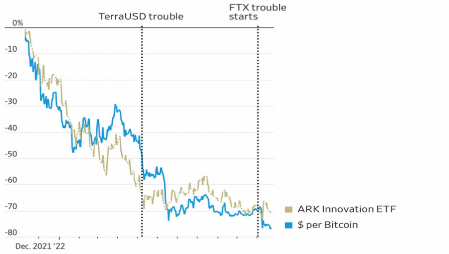 Биткойн будет смеяться последним?ИнстаФорекс - Instaforex, 2 года назад 77%-й обвал BTCUSD и крах FTX – это конец криптозимы или начало конца? Кто-то говорит, что лопнувшие активы-пузыри проседают на 80–90%, прежде чем нащупать дно, так что финиш не за горами. Кто-то, напротив, ссылается на утрату доверия. Отмечает, что криптоэнтузиасты слишком долго смеялись над фиатными валютами, однако по факту может оказаться так, что фиатные валюты будут смеяться последними. Разброс мнений настолько велик, а неопределенность относительно будущего биткойна настолько высока, что сумасшедший дифференциал прогнозов никого не удивляет. BCA Research, ссылаясь на рост реальной доходности долговых обязательств, что увеличивает издержки владения крипто-валютами, утверждает, что BTCUSD упадет до 5000. Ark Investment Management, напротив, настаивает, что самое худшее уже позади и ждет взлета котировок до 1000000 в 2030. Впрочем, оптимизм последней компании обусловлен верой в восстановление связанного с ней ETF. Динамика BTCUSD и ARK Innovation ETF Долгое время поклонники криптовалют доказывали их преимущества децентрализацией финансов. Дескать, в криптоиндустрии нет банков, которые могут обанкротиться и лишить вкладчиков их денег. На самом деле система была даже более централизована, чем банковская. Исследования, на которые ссылается Financial Times, утверждают, что около 90% проданных в 2022 биткойнов хранилось на биржах. Крах одной из них FTX подорвал доверие ко всей системе. Безусловно, можно утверждать, что банкротство биржи – это еще не ломка всей криптоиндустрии. Но скажите это тем, кто потерял деньги! Что это было? Жадность, некомпетентность или мошенничество? Этим вопросом занимается суд. Если все-таки речь шла о мошенничестве, то новость может быть хорошей. Точно так же, как взрывы лопнувших пузырей заканчиваются на отметках -80-90% от их первоначальной стоимости, мошенничества в 20-21 веках, как правило, раскрываются на финише цикла. До тех пор пока не начнется повышение ставок и отрасль не окажется под давлением, обманывающие инвесторов люди чувствуют себя как рыба в воде. Очень похожая история случилась с FTX. ФРС агрессивно ужесточает денежно-кредитную политику, весь спектр рискованных активов, включая криптовалюту, находится под давлением, и тут происходит банкротство одной из крупнейших бирж. Потерять доверие легко, а восстанавливать его приходится годами. Работающие в режиме «купил и держи» инвесторы теперь прекрасно понимают, что длительное нахождение биткойна в портфелях крайне опасно. Можно легко найти альтернативные активы с похожими характеристиками. Другое дело, что стабилизация BTCUSD на текущих уровнях вернет на рынок Жадность. Технически на дневном графике биткойна продолжается нисходящий тренд. Неспособность BTCUSD зацепиться за справедливую стоимость на 16600 является признаком их слабости и дает основание продавать актив в направлении 15000 и 14700. Напротив, возвращение выше 16600 усилит риски роста котировок к 17000 и 17500. Материал предоставлен компанией InstaForex - www.instaforex.com |
