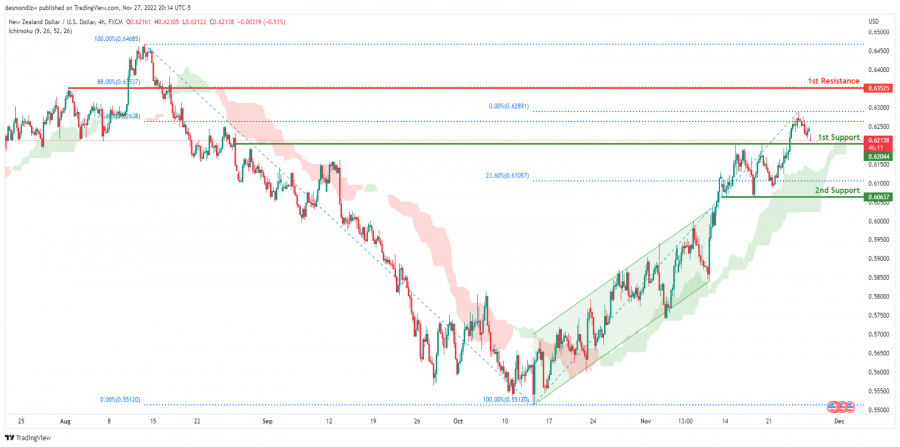 NZD/USD торгуется с бычьим уклоном. Прогноз на 28 ноября 2022ИнстаФорекс - Instaforex, 2 года назад На 4-часовом графике пара NZD/USD торгуется с бычьим уклоном. Цена пробила восходящий канал и сейчас движется выше облака Ишимоку. Если бычий импульс сохранится, ожидается, что цена продолжит рост к 1-му уровню сопротивления 0.63525, где расположен уровень коррекции Фибоначчи 88%. В качестве альтернативы цена может развернуться вниз и повторно протестировать 1-й уровень поддержки 0.62044, соответствующий уровню коррекции Фибоначчи 78.6%. Торговая рекомендация Вход: 0.62044 Условия для входа: 1-й уровень поддержки Тейк-профит: 0.63525 Условия для фиксации прибыли: 1-й уровень сопротивления Стоп-лосс: 0.60637 Условия для активации ордера стоп-лосс: 2-й уровень поддержки Материал предоставлен компанией InstaForex - www.instaforex.com |