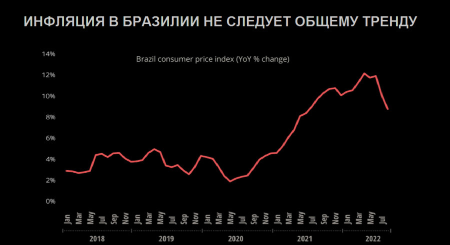 Инфляция в Бразилии не следует за мировым трендомИнстаФорекс - Instaforex, 2 года назад Центральный банк Бразилии отчитался, что за октябрь коэффициент дефолта по потребительским и деловым кредитам - один из показателей финансовой стабильности инвестиций - вырос в Бразилии до самого высокого уровня почти за четыре года. Инфляция в Бразилии не следует за мировым трендомКоэффициент дефолтов по нецелевым кредитам увеличился до 4,2% с 4,1% в сентябре, что является самым высоким показателем за 48 месяцев начиная с августа 2018 года (тогда показатель составил 4,22%). Основной причиной представители регулятора называют высокую стоимость заимствований и агрессивное ужесточение денежно-кредитной политики. Параллельно выросли спреды по банковским кредитам до 30,3% с 28,6% месяцем ранее. Стоит ли овчинка выделки?Экономика Бразилии удивила инвесторов своим ростом в этом году. При этом реальный ВВП во втором квартале оказался выше медианных прогнозов. Только во втором квартале экономика смогла вырасти на 1,2%. Потребительские расходы пока опережают снижение государственного потребления и экспорта, что говорит о том, что бразильцы еще не начали экономить. Более того, экономический рост в этом квартале был широко распространен, и буквально каждая крупная отрасль продемонстрировала положительный рост - от производства какао-бобов до добычи полезных ископаемых. Бразилия - традиционно сырьевая страна. Высокие цены на сырьевые товары ранее поддерживали достаточно стабильный рост, поскольку страна получала хорошие премии за значительный экспорт нефти, железной руды и сельскохозяйственных товаров. Увы, сейчас цены на многие из этих сырьевых товаров падают на фоне опасений глобальной рецессии. Экономика также борется с высокой инфляцией и связанными с ней более высокими процентными ставками. И хотя инфляция начала снижаться, а центральный банк пока приостановил повышение ставок, ожидается, что в следующем году экономика все же снизит темпы достаточно серьезно. Инфляционная составляющаяБразилия, как и многие другие страны мира, прямо сейчас упорно борется с высокой инфляцией. В пользу этого региона можно отметить ранее и агрессивное повышение ставок Banco Central do Brasil (BCB). Фактически BCB был одним из самых агрессивных в отношении денежно-кредитной политики, впервые подняв ставки в начале 2021 года. С тех пор BCB осуществил более десяти последовательных повышений ставок, прежде чем достаточно неожиданно взять паузу в сентябре 2022 года. В итоге прогнозы экспертов сошлись на том, что, вероятнее всего, учетная ставка центрального банка в конечном итоге достигнет 13,75%. С началом инфляции в США, потребительская инфляция у его южного соседа ускорилась до 12,1% в годовом исчислении в апреле 2022 года. Но что более примечательно, она уже снизилась до 8,7% в годовом исчислении - аккурат к августу. Правда, более высокие процентные ставки, сопровождаемые ослаблением инфляции, фактически повысили реальную (или скорректированную с учетом инфляции) процентную ставку. Несмотря на ястребиную политику, BCB все еще может столкнуться с трудностями, чтобы вернуть инфляцию в свой целевой диапазон. Собственные прогнозы центрального банка показывают, что инфляция останется выше верхнего целевого диапазона до четвертого квартала 2023 года. Если честно, это гораздо дольше, чем планируют та же 