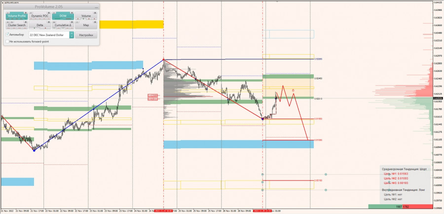 Среднесрочная тенденция: в шорт. Максимальное скопление объемов среднесрочной тенденции расположено в диапазоне по котировкам 0.62011-0.62089. В настоящий момент по паре совершаются инвестиционные операции ниже, указывая на силу продавцов.