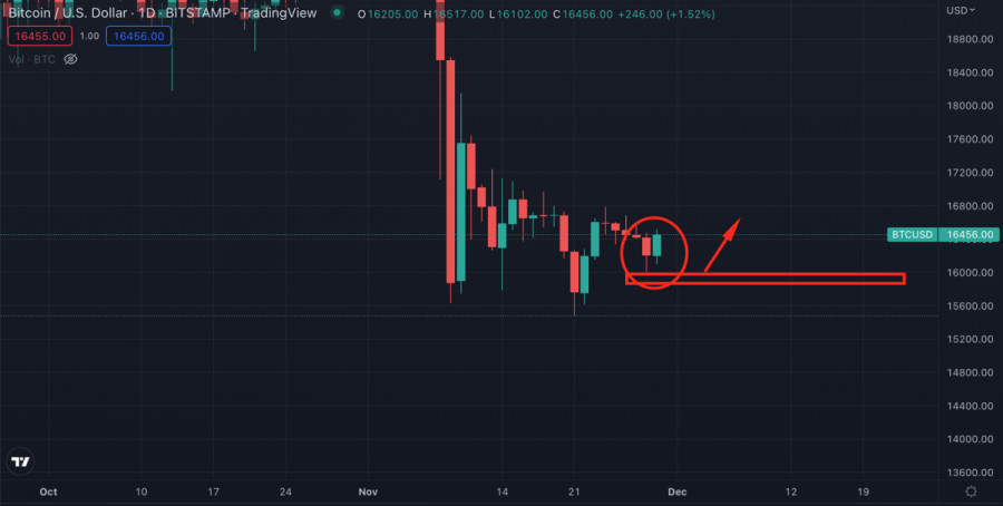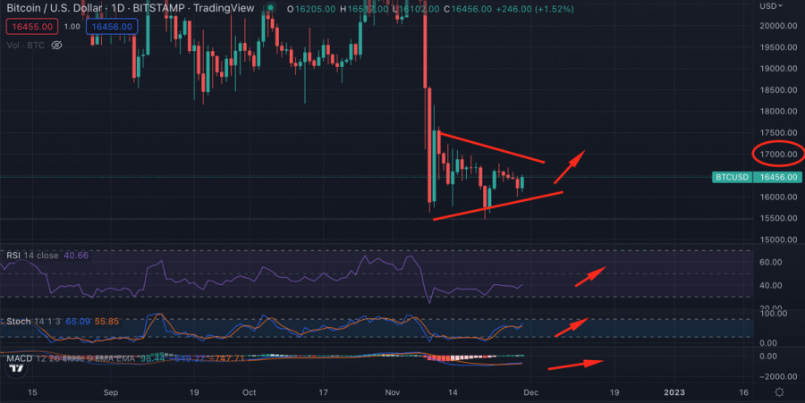 Биткоин удерживает шаткий баланс, но рискует отправиться на обновление локального днаИнстаФорекс - Instaforex, 2 года назад Основным полем битвы за последние несколько недель стал диапазон $15,5k-$16,6k. На прошлой неделе Биткоин сделал важный восстановительный шаг, показав рост два дня кряду и закрепился выше $16,1k. Это ключевая зона поддержки, которая способна стать плацдармом для дальнейшего роста актива. Несмотря на сверхусилия быков, уровень $16,1k постоянно подвергается проверке за счет негативных факторов, которые усиливают давление продавцов. По состоянию на 29 ноября можно заявить, что позиции быков крепки и уровень $16,1k остается нетронутым. Фундаментальный фонУдержание уровня $16,1k ставится под сомнение, учитывая надвигающиеся события, которые в совокупности с уже существующими негативными факторами могут обвалить крипторынок. Первым и ключевым ончейн-фактором снижения BTC является падение доходов майнеров до двухлетнего минимума. Помимо этого, восстанавливается корреляция Биткоина и фондовых индексов, но в текущей ситуации это играет против криптовалют. В Китае вспыхнули крупнейшие за 30 лет протесты из-за ковид-ограничений. Они повлияли на китайский фондовый рынок и спровоцировали RISK OFF-стратегию, пока митинги не утихнут. Также стало известно, что криптофирма BlockFi объявила о запуске банкротства по статье 11. Спустя время после анонса котировки Биткоина вновь протестировали уровень $15,6k, но стоит отметить снижение объемов реакции на негативные новости. При этом сохраняется позитивная динамика на накопление монет BTC долгосрочными инвесторами. Согласно данным Glassnode, число адресов с балансом от 1 до 10 BTC вскоре может обновить абсолютный рекорд выше уровня 800 000. Также завтра ожидается повышенная волатильность, так как будут опубликованы данные о росте экономики США в третьем квартале (прогноз +2,7%). Помимо этого, глава ФРС Пауэлл подготовит рынки к повышению ставки в декабре и озвучит политику ведомства в 2023. Анализ BTC/USDБиткоин остается запертым в узкий канал колебаний $15,6k-$16,6k, где происходит массовый процесс накопления. Кошельки с балансами менее, чем 1 BTC увеличили свои вложения на 96 200 BTC, что соответствует историческому пику по откупу локального дна. Несмотря на продолжающийся процесс поглощения, главной задачей Биткоина остается удержание уровня $16,1k. Криптовалюта движется в рамках формирующегося треугольника, и, чтобы иметь шансы для восходящего пробоя, важно сохранять плацдарм выше $16,1k. По итогам понедельника цена BTC опускалась ниже $16,1k и тестировала уровень поддержки $15,5k. С одной стороны, мы видим резко негативное влияние новостей на поведение инвесторов, но с другой - мгновенный откуп указывает на силу покупателей. Технические метрики BTC/USD возобновили восходящее движение, а BTC закрепился выше $16,4k. Индекс RSI указывает на растущие покупательские настроения, а стохастик сформировал бычье пересечение, что говорит о наличии локального восходящего тренда. Индикатор MACD также продолжает восходящее движение, что говорит о фундаментальной готовности актива продолжать движение к локальным максимумам. Учитывая это, вполне вероятно, что нас ожидает штурм диапазона $16,6k-$16,8k. При уверенном закреплении выше этих позиций цена двинется к ключевому уровню сопротивления на $17,1k. ИтогиБиткоин сохраняет бычий настрой и откуп после ретеста 