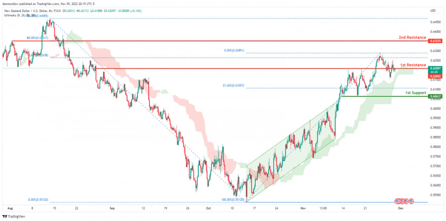 NZD/USD: сохраняется потенциал для дальнейшего роста. Прогноз на 30 ноября 2022ИнстаФорекс - Instaforex, 3 года назад На 4-часовом графике пара NZD/USD торгуется в восходящем направлении. Цена пробила восходящий канал и сейчас движется выше облака Ишимоку. Если бычий импульс сохранится, ожидается, что цена продолжит движение к 1-му уровню сопротивления 0.62092, соответствующему уровню коррекции Фибоначчи 88%. В качестве альтернативы цена может развернуться вниз и повторно протестировать 1-й уровень поддержки 0.62044, который находится немного ниже уровня коррекции Фибоначчи 78.6%. Торговая рекомендация Вход: 0.62092 Условия для входа: 1-й уровень сопротивления Тейк-профит: 0.60637 Условия для фиксации прибыли: 1-й уровень поддержки Стоп-лосс: 0.62891 Условия для активации ордера стоп-лосс: предыдущий уровень свинг-хай Материал предоставлен компанией InstaForex - www.instaforex.com |