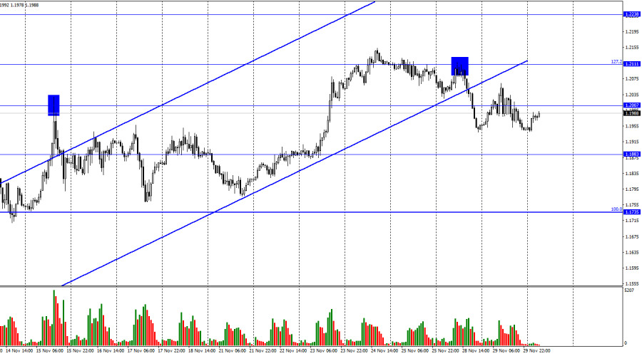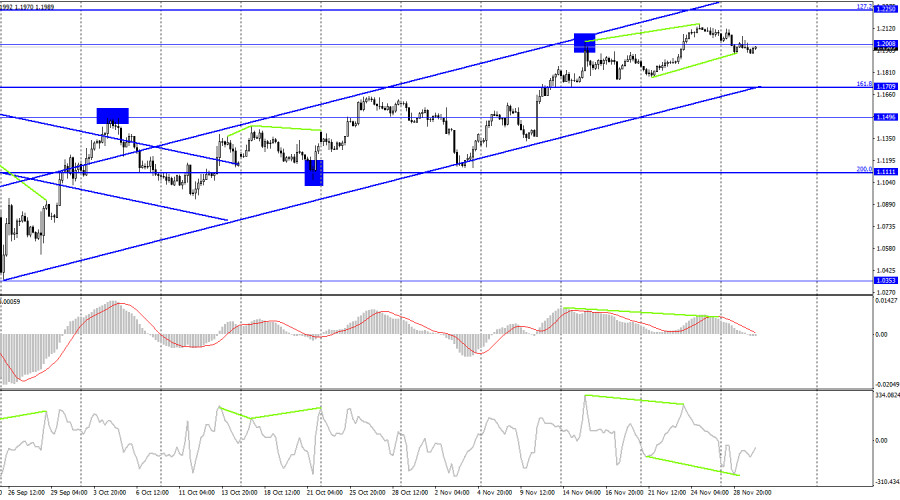 На 4-часовом графике пара выполнила закрепление под уровнем 1,2008, что позволяет рассчитывать на продолжение падения в направлении уровня Фибо 161,8% - 1,1709. «Бычья» дивергенция довольно слаба, но и закрепление под 1,2008 не слишком убедительное. Оба этих сигнала я не считаю сильными. А вот трендовый коридор – считаю, поэтому пока что не рассчитываю на более сильное падение пары, чем до 1,1709.