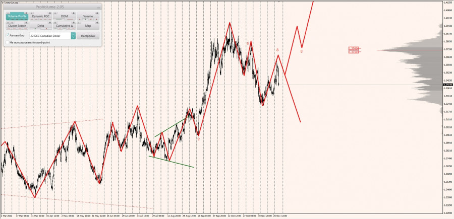 Среднесрочная тенденция: в шорт. Максимальное скопление объемов среднесрочной тенденции расположено в диапазоне по котировкам 1.35808-1.35883. В настоящий момент по паре совершаются инвестиционные операции ниже, указывая на силу продавцов.