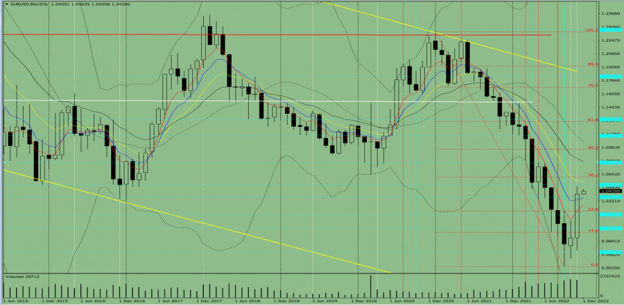 Технический анализ на декабрь месяц 2022 по валютной паре EUR/USDИнстаФорекс - Instaforex, 2 года назад Трендовый анализ. В декабре от уровня 1.0323 (закрытие ноябрьской месячной свечи) движение вверх до цели 1.0609 – откатный уровень 38.2% (красная пунктирная линия). При тестировании этого уровня продолжение движения вверх с целью исторический уровень сопротивления 1.0784 (голубая пунктирная линия). При тестировании этого уровня возможен откат вниз. Рис. 1 (месячный график). Индикаторный анализ: - индикаторный анализ – вверх; Вывод по комплексному анализу: вероятнее всего верхняя работа. Общий итог расчёта свечи валютной пары EUR/USD по месячному графику: цена, вероятнее всего, будет иметь восходящую тенденцию с отсутствием первой нижней тени (первая неделя месяца – белая) у месячной белой свечи и отсутствием второй верхней тени (последняя неделя - белая). Общий сценарий: от уровня 1.0323 (закрытие ноябрьской месячной свечи) движение вверх до цели 1.0609 – откатный уровень 38.2% (красная пунктирная линия). При тестировании этого уровня продолжение движения вверх с целью исторический уровень сопротивления 1.0784 (голубая пунктирная линия). При тестировании этого уровня возможен откат вниз. Альтернативный сценарий: от уровня 1.0323 (закрытие ноябрьской месячной свечи) движение вверх до цели 1.0609 – откатный уровень 38.2% (красная пунктирная линия). При тестировании этого уровня продолжение движения вверх с целью исторический уровень сопротивления 1.0784 (голубая пунктирная линия). По достижении этого уровня продолжение верхней работы до цели 1.0941 – откатный уровень 50.0% (голубая пунктирная линия). При тестировании этого уровня возможен откат вниз. Материал предоставлен компанией InstaForex - www.instaforex.com |