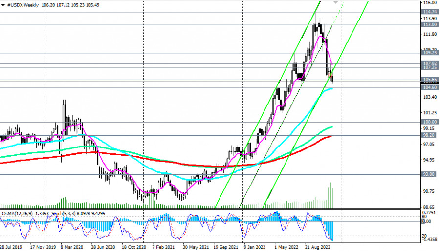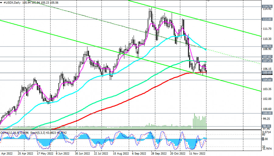 Индекс доллара #USDX: технический анализ и торговые рекомендации на 01.12.2022ИнстаФорекс - Instaforex, 2 года назад Как мы отметили в нашем сегодняшнем «Фундаментальном анализе», «уровень поддержки 105.00 на графике DXY пока что стоит и сопротивляется пробою, и, по мнению экономистов, уровень 105.00 должен удержать индекс доллара DXY от более глубокого падения». С технической же точки зрения индекс доллара DXY (CFD #USDX в торговом терминале МТ4) нашел поддержку на сильном и важном уровне 105.65 (200-периодная скользящая средняя на дневном графике CFD #USDX). Рост в зону выше уровней сопротивления 107.25 (ЕМА144 на дневном графике), 107.82 (локальный уровень сопротивления) станет сигналом возобновления восходящей динамики DXY. В альтернативном сценарии пробой уровня поддержки 104.60 (ЕМА50 на недельном графике) может значительно ухудшить перспективы доллара и его индекса DXY, переведя их в зону медвежьего рынка. Пробой же ключевого уровня поддержки 98.20 (ЕМА200 на недельном графике) окончательно сломает бычий тренд DXY. *) о важных событиях недели см. в Важнейшие экономические события недели 28.11.2022 – 04.12.2022 Уровни поддержки: 105.65, 105.00, 104.60 Уровни сопротивления: 107.25, 107.82, 108.00, 109.00, 109.25, 110.00, 111.00, 113.00