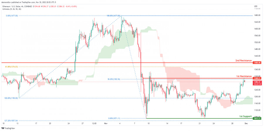 ETH/USD: возможен разворот тренда. Прогноз на 1 декабря 2022ИнстаФорекс - Instaforex, 2 года назад На 4-часовом графике пара ETH/USD торгуется в медвежьем тренде. Однако сейчас цена находится выше облака Ишимоку, что указывает на признаки зарождающегося бычьего импульса. Ожидается, что цена пробьет 1-й уровень сопротивления 1308.21, соответствующий уровню коррекции Фибоначчи 38.2%, и затем направится ко 2-му уровню сопротивления 1400.48, где расположен уровень коррекции Фибоначчи 61.8%. В альтернативном сценарии цена может вернуться к 1-му уровню поддержки 1071.11, который соответствует предыдущему уровню свинг-лоу. Торговая рекомендация Вход: 1308.21 Условия для входа: 1-й уровень сопротивления Тейк-профит: 1071.11 Условия для фиксации прибыли: 1-й уровень поддержки Стоп-лосс: 1677.00 Условия для активации ордера стоп-лосс: чуть выше области, где расположен 2-й уровень сопротивления Материал предоставлен компанией InstaForex - www.instaforex.com |