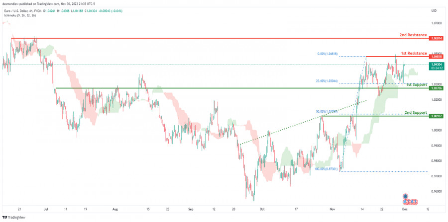 EUR/USD: ожидается усиление бычьего импульса. Прогноз на 1 декабря 2022ИнстаФорекс - Instaforex, 2 года назад На 4-часовом графике пара EUR/USD торгуется в бычьем тренде. В настоящее время цена находится выше облака Ишимоку, что указывает на восходящий импульс. Кроме того, цена также пробила восходящую линию тренда, что также подтверждает бычий настрой. Если бычий импульс сохранится, ожидается, что цена направится к 1-му уровню сопротивления 1.04818, где расположен предыдущий уровень свинг-хай. В альтернативном сценарии цена может вернуться к 1-му уровню поддержки 1.02766, соответствующему уровню коррекции Фибоначчи 23.6%, и затем направиться ко 2-му уровню поддержки 1.00937, который соответствует 50% уровню коррекции Фибоначчи. Торговая рекомендация Вход: 1.04284 Условия для входа: немедленный вход с целью поймать бычий импульс Тейк-профит: 1.06014 Условия для фиксации прибыли: 2-й уровень сопротивления и предыдущий уровень свинг-хай Стоп-лосс: 1.02766 Условия для активации ордера стоп-лосс: 1-й уровень поддержки и предыдущий уровень свинг-лоу Материал предоставлен компанией InstaForex - www.instaforex.com |