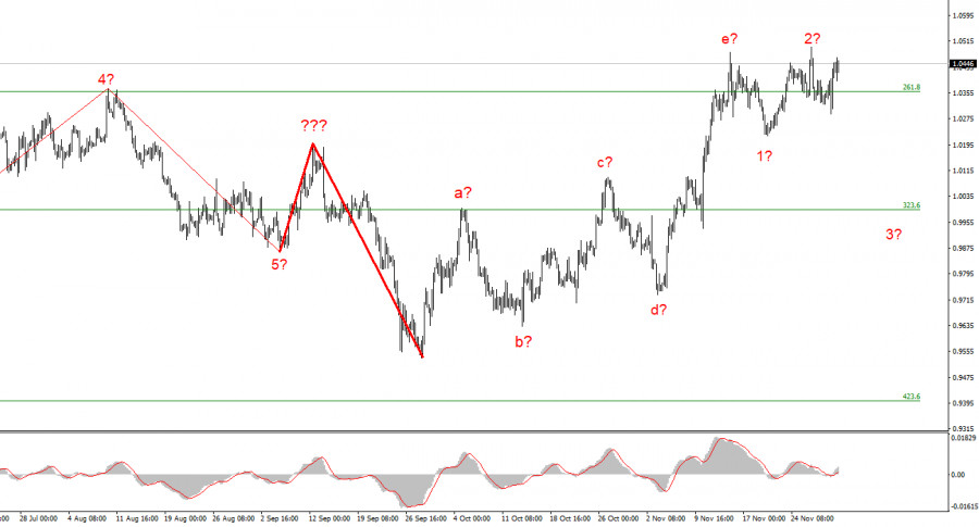 Анализ EUR/USD. 1 декабря. Доллар снизился и вновь грозится сломать волновую разметку.ИнстаФорекс - Instaforex, 3 года назад Волновая разметка 4-часового графика для инструмента Евро/Доллар по-прежнему выглядит вполне убедительно, но уже начинает требовать внесения коррективов. Повышательный участок тренда принял ярко выраженный коррекционный вид. Мы получили сложную коррекционную структуру волн a-b-c-d-e. Если текущая волновая разметка верна, то построение этой структуры может близиться к своему завершению или уже завершено, так как пик волны e превышает пик волны с. В этом случае нас ожидает построение минимум трех волн вниз, но если последний участок тренда был коррекционным, то следующий – будет, вероятнее всего, импульсным. Поэтому я готовлюсь к новому сильному снижению инструмента. Новая удачная попытка прорыва отметки 1,0359, что соответствует 261,8% по Фибоначчи, укажет на готовность рынка к продажам. Однако, отход котировок достигнутых минимумов на этой неделе означает, что вся волна e может получиться более протяженной, а последнее снижение инструмента – не первая волна нового нисходящего участка. Тем не менее, предполагаемая волна 2 или b все же может быть таковой, так как она лишь проколола пик волны e. В общем, волновая картина начинает запутываться из-за того, что спрос на валюту США не растет. Рынок даже не слушал Пауэлла.Инструмент Евро/Доллар в четверг повысился на 60 базовых пунктов, а вчера – еще на 70. Таким образом, волна e находится все ближе и ближе к тому, чтобы принять более сложный и протяженный вид. К сожалению, и весь повышательный участок тренда может принять более сложный вид, и при текущем развитии событий сделать это еще не один раз. Напомню, что понижательный участок в течение последних 2 лет неоднократно принимал более протяженный вид, чем можно было бы спрогнозировать, а восходящие коррекционные волны стали настоящей редкостью. Похоже, что сейчас ситуация меняется на противоположную. Даже в те дни, когда доллару ничего не угрожает, спрос на него все равно может упасть. Вчерашний день не предвещал никакой беды. Европейская инфляция снизилась до 10%, американский ВВП вырос на 2,9% в третьем квартале. Отличные условия для роста американской валюты. Однако вместо этого мы наблюдали новое повышение котировок, потому что вечером состоялось выступление президента ФРС Джерома Пауэлла и рынку показалось, что его риторика стала чуть более «голубиной», чем ранее. Сам я так не считаю, так как основные тезисы, которые были озвучены, не меняются уже несколько недель или месяцев подряд. И озвучивает их не только Пауэлл, но и другие члены FOMC. Но рынок хотел вновь продавать, рынок вновь продавал. Я все еще стараюсь верить в то, что ожидаемая нисходящая волна или набор волн будет построена, но верить в это становится все сложнее. Сегодня в Евросоюзе вышел только индекс деловой активности в сфере производства, а в Америке аналогичный индекс еще даже не вышел. Если завтра Пэйроллы не окажутся сильно лучше ожиданий рынка, то рост инструмента может быть продолжен. Общие выводы.Исходя из проведенного анализа, я делаю вывод, что построение восходящего участка тренда усложнилось до пяти волнового и завершено(или близится к своему завершению). Таким образом, советую продажи с целями, расположенными около расчетной отметки 0,9994, что соответствуе