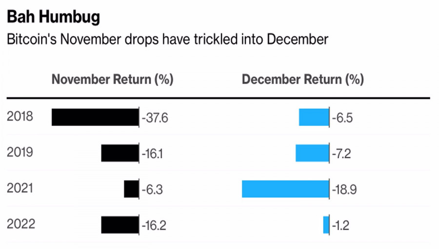 Последний вздох биткойна?ИнстаФорекс - Instaforex, 2 года назад По итогам ноября биткойн потерял около 16% своей стоимости, и если сезонные закономерности продолжатся, то и декабрь рискует стать для «быков» по BTCUSD разочарованием. История показывает, что за последнее десятилетие так происходило всегда: лидер сектора криптовалют заканчивал год плохо, если закрывал последний месяц осени в красной зоне. Наиболее ярко эта закономерность проявила себя в 2018, 2019 и 2021. По итогам этих лет средняя просадка токена в декабре составила 11%. Чем все закончится на этот раз? Динамика биткойна в ноябре и декабре В то время как поклонники криптовалют рассматривают их стабилизацию на рубеже осени и зимы как одно из доказательств формирования дна, их противники считают по-другому. Они не стесняются в выражениях, называя биткойн беспрецедентным загрязнителем и сомнительным средством платежа. Дескать, ценность токена основана исключительно на спекуляциях и манипуляциях отдельных бирж, а текущий отскок BTCUSD – не более чем последний вздох. На фоне банкротства FTX в этом есть некоторая логика. Если его глава не лжет, утверждая, что виной всему некомпетентность, а не мошенничество, то криптоотрасль рискует еще глубже увязнуть в кризисе. Только представьте себе, что будет, если большинство криптоинститутов просто исчезнет? В любом случае сейчас на повестке дня стоит вопрос оценки кредитного риска и платежеспособности контрагента, а спровоцированное FTX заражение рискует переброситься на другие компании. Для биткойна недоверие к брокерам чревато отставанием от других рискованных активов. Его высокая корреляция с американскими фондовыми индексами тает на глазах, и сезонная сила рынка акций США в конце года или так называемое ралли Санта-Клауса могут пройти лидера сектора криптовалют стороной. Динамика корреляции биткойна и Nasdaq Composite Даже наиболее ярые поклонники токена уже не так уверены в своих «бычьих» прогнозах. В частности, ранее утверждавший, что котировки BTCUSD в течение 5 лет достигнут отметки 500000, Galaxy Digital теперь пытается сделать хорошую мину при плохой игре. По мнению компании, из-за чрезмерно агрессивного повышения ставки ФРС реализация прогноза откладывается на неопределенное время. На мой взгляд, биткойн остается рискованным активом и должен жить жизнью рискованных активов, поэтому динамика фондовых индексов США будет по-прежнему выступать для него путеводной звездой. Другое дело, что прогнозы экспертов Bloomberg по S&P 500 давненько не отличались такой разбежкой. «Быки» считают, что он вырастет на 10% к декабрю 2023, «медведи» делают ставку на падение на 17%. Технически неспособность BTCUSD зацепиться за пивот-уровень 17000 – плохой знак для покупателей. Лишь возвращение выше данной отметки с последующим обновлением декабрьского пика станет основанием для покупок. Напротив, падение котировок ниже справедливой стоимости на 16600 усилит риски восстановления нисходящего тренда и откроет дверь для продаж. Материал предоставлен компанией InstaForex - www.instaforex.com |
