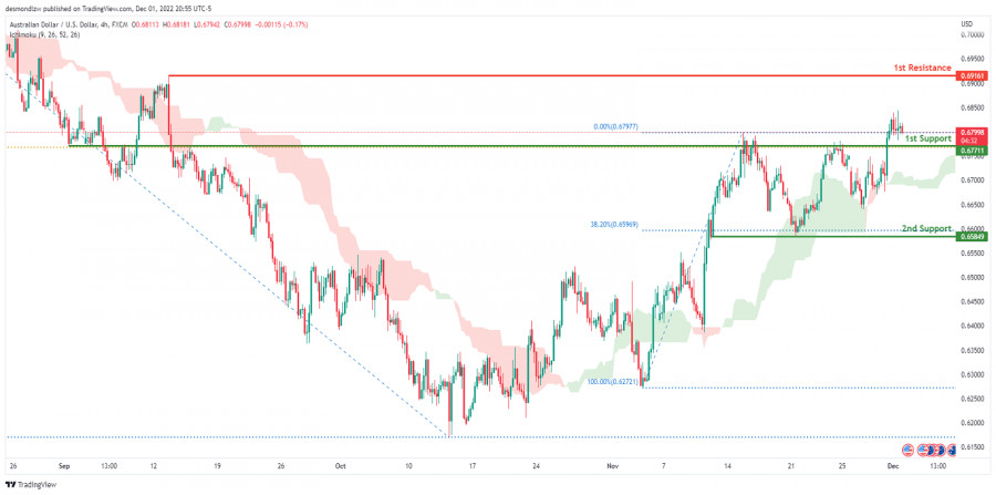 AUD/USD развивает бычий импульс. Прогноз на 2 декабря 2022 г.ИнстаФорекс - Instaforex, 2 года назад На 4-часовом графике пара AUD/USD торгуется в бычьем тренде. В настоящее время цена находится выше облака Ишимоку, что указывает на восходящий импульс. Ожидается, что цена продолжит движение к 1-му уровню сопротивления 0.69161, где расположен предыдущий уровень свинг-хай. В альтернативном сценарии цена может развернуться вниз и повторно протестировать 1-й уровень поддержки 0.67711, соответствующий уровню коррекции Фибоначчи 61.8%. Торговая рекомендация Вход: 0.67711 Условия для входа: 1-й уровень поддержки Тейк-профит: 0.69161 Условия для фиксации прибыли: 1-й уровень сопротивления и предыдущий уровень свинг-хай Стоп-лосс: 0.65849 Условия для активации ордера стоп-лосс: 2-й уровень поддержки и предыдущий уровень свинг-лоу Материал предоставлен компанией InstaForex - www.instaforex.com |