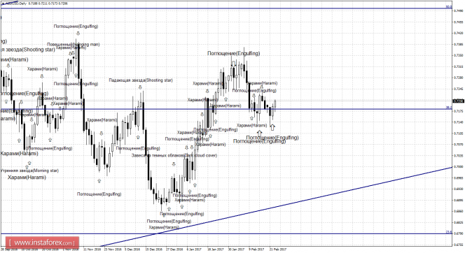 Свечной анализ NZD/USD на 23 февраляИнстаФорекс - Instaforex, 8 лет назад Daily Еще одна сильная бычья формация «Поглощение» вновь позволила котировкам выполнить разворот в пользу валюты Новой Зеландии и закрепление над уровнем коррекции 38,2% - 0,7181. В итоге процесс роста продолжается в направлении коррекционного уровня 50,0% - 0,7498. Образование медвежьей формации позволит рассчитывать на разворот в пользу американской валюты и будет трактоваться как коррекционный сигнал, а также позволит ожидать некоторого падения котировок. Закрепление курса пары под уровнем Фибо 38,2% сработает в пользу продолжения падения в направлении следующего уровня коррекции 23,6% - 0,6789. Сетка Фибо построена по экстремумам от 10 июля 2014 года и 24 августа 2015 года. 4h Во время вчерашнего ночного и утреннего флэта пара образовала сразу 4 слабые формации, которые никакого влияния не оказали. После этого процесс роста котировок возобновился в направлении коррекционного уровня 61,8% - 0,7246, несмотря на слабую медвежью формацию «Харами». Образование 23 февраля еще одной медвежьей формации вновь позволит трейдерам рассчитывать на разворот в пользу валюты США и возврат к уровню Фибо 50,0% - 0,7173. Отбой котировок от уровня коррекции 61,8% аналогично сработает в пользу доллара. Закрепление пары над уровнем Фибо 61,8% повысит вероятность дальнейшего роста в направлении коррекционного уровня 76,4% - 0,7337. Сетка Фибо построена по экстремумам от 7 сентября 2016 года и 23 декабря 2016 года. Уточнения: Слабые свечные формации будут отмечаться обычным текстом и размером стрелок. Сильные свечные формации будут отмечаться более жирным текстом и большим размером стрелок. Материал предоставлен компанией InstaForex - www.instaforex.com |