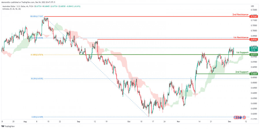 AUD/USD: ожидается усиление бычьего импульса. Прогноз на 5 декабря 2022ИнстаФорекс - Instaforex, 2 года назад На 4-часовом графике пара AUD/USD торгуется в бычьем тренде. В настоящее время цена находится выше облака Ишимоку, что указывает на восходящий импульс. Ожидается, что цена продолжит движение к 1-му уровню сопротивления 0.69161, соответствующему предыдущему уровню свинг-хай и уровню коррекции Фибоначчи 78.6%. В альтернативном сценарии цена может развернуться вниз и повторно протестировать 1-й уровень поддержки 0.67711, где расположен уровень коррекции Фибоначчи 61.8%. Торговая рекомендация Вход: 0.68293 Условия для входа: немедленный вход, чтобы воспользоваться преимуществом бычьего импульса Тейк-профит: 0.69161 Условия для фиксации прибыли: 1-й уровень сопротивления и предыдущий уровень свинг-хай Стоп-лосс: 0.67427 Условия для активации ордера стоп-лосс: чуть ниже 1-го уровня поддержки и предыдущего лоу Материал предоставлен компанией InstaForex - www.instaforex.com |