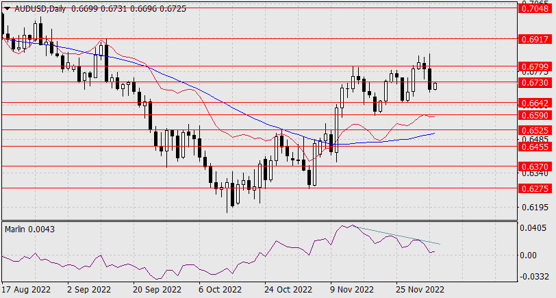Прогноз по AUD/USD на 6 декабря 2022 годаИнстаФорекс - Instaforex, 2 года назад По итогу понедельника индекс доллара укрепился на 0,78%, нефть подешевела на 3,66%, австралийский доллар был утянут вниз на 1,37%. Цена преодолела поддержку 0.6730, сегодня в азиатскую сессию пытается подрасти, впрочем, не теряя возможности закрепления под уровнем. Цена сможет отработать целевую поддержку 0.6642 в случае преодоления минимума вчерашнего дня 0.6688 – в этом случае сигнальная линия осциллятора Марлин преодолеет нулевую линию и переместится на территорию нисходящей тенденции. Дивергенция продолжает оказывать своё действие на цену.